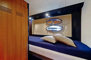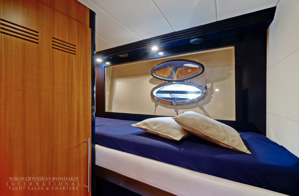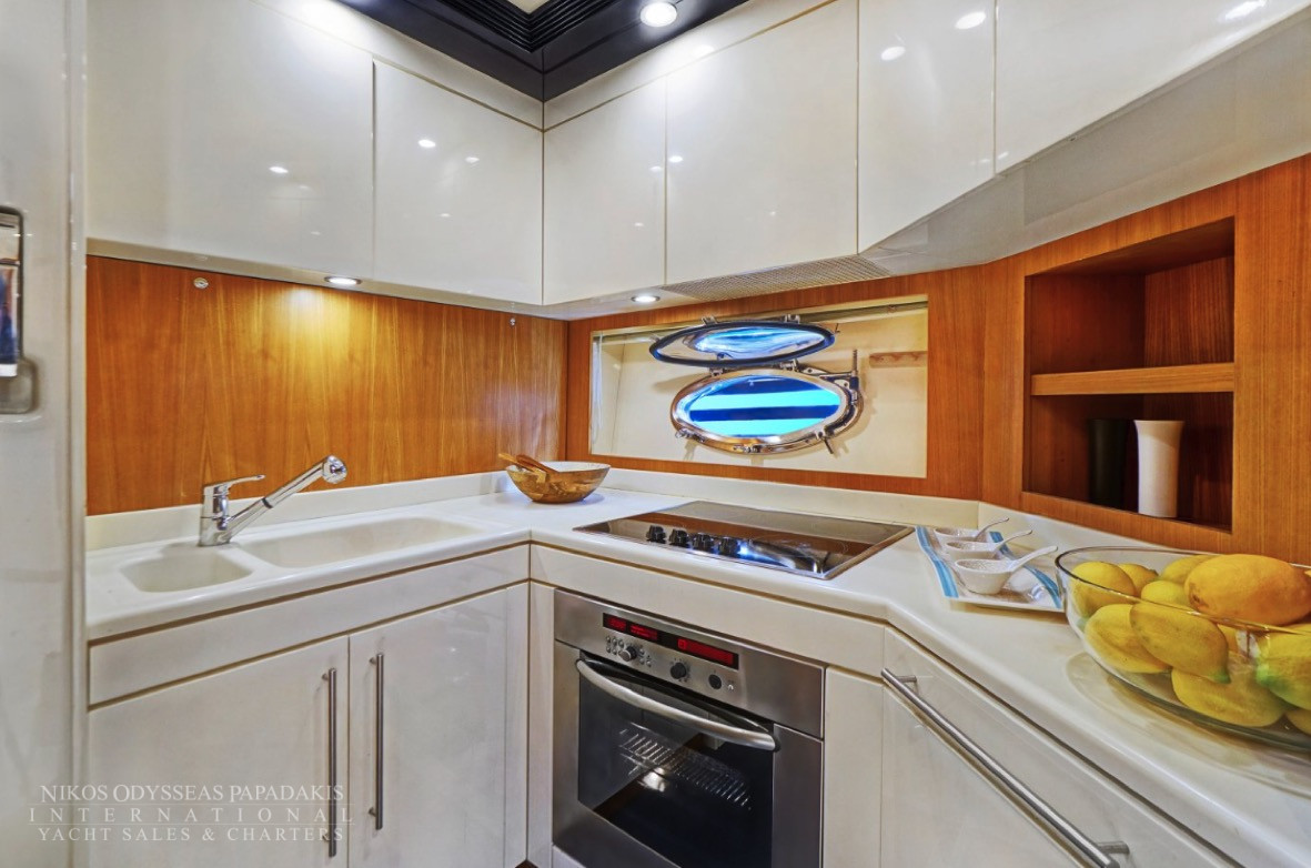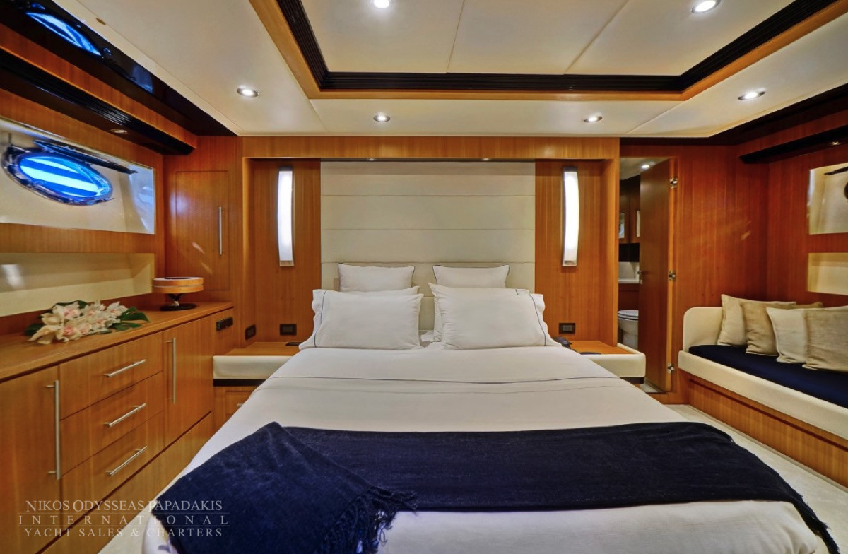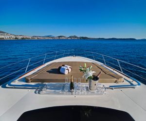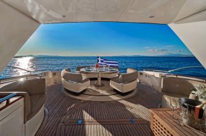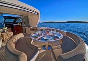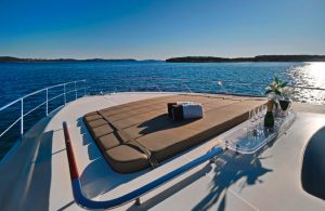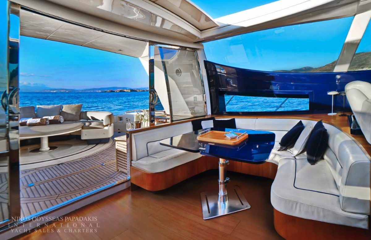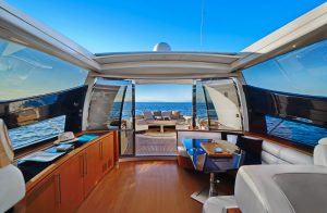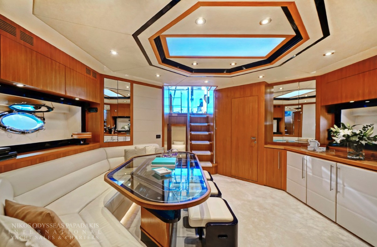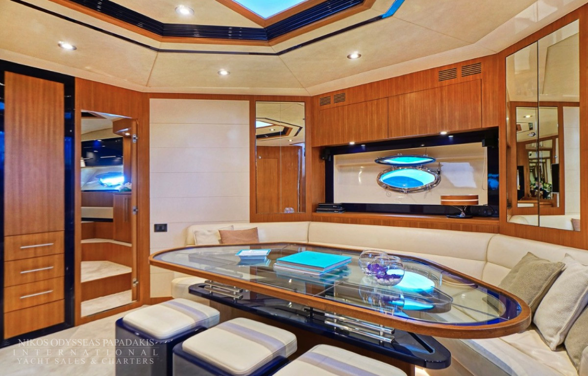 Hub The star attraction is the expansive aft deck, seamlessly connected to the meticulously designed main saloon – a welcoming haven with plush seating, premium entertainment systems, and versatile media options. Host intimate gatherings at the dining table for 10 guests, which converts into a massive sunpad for lounging under the Mediterranean sun.