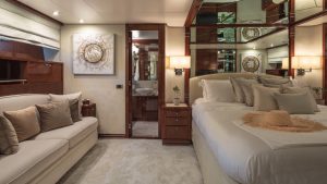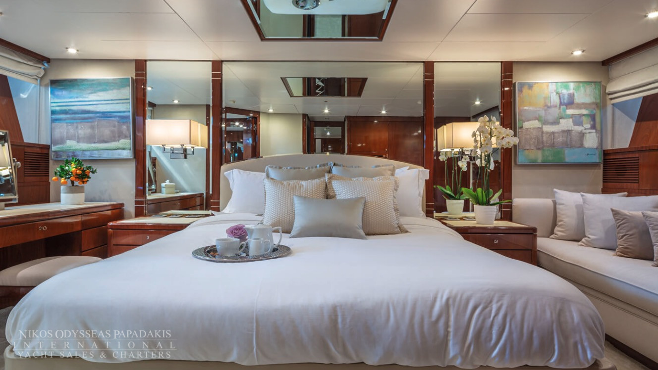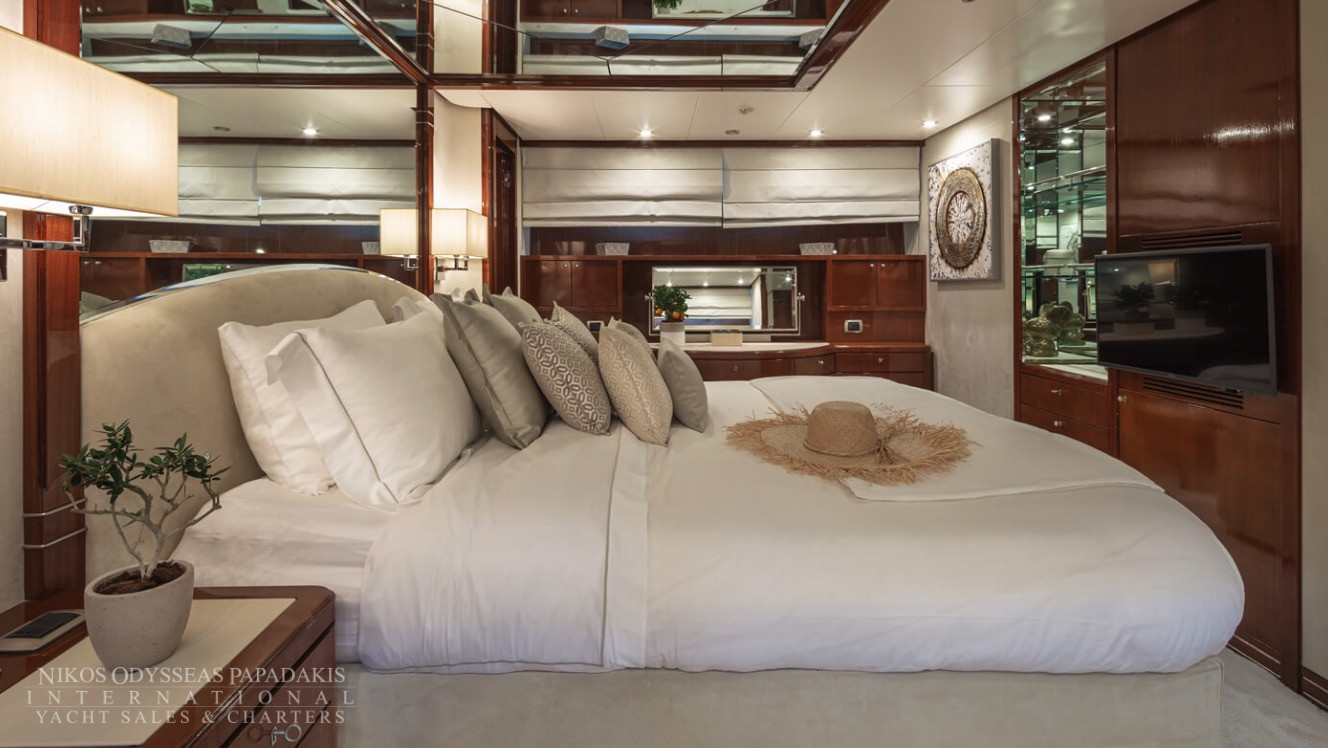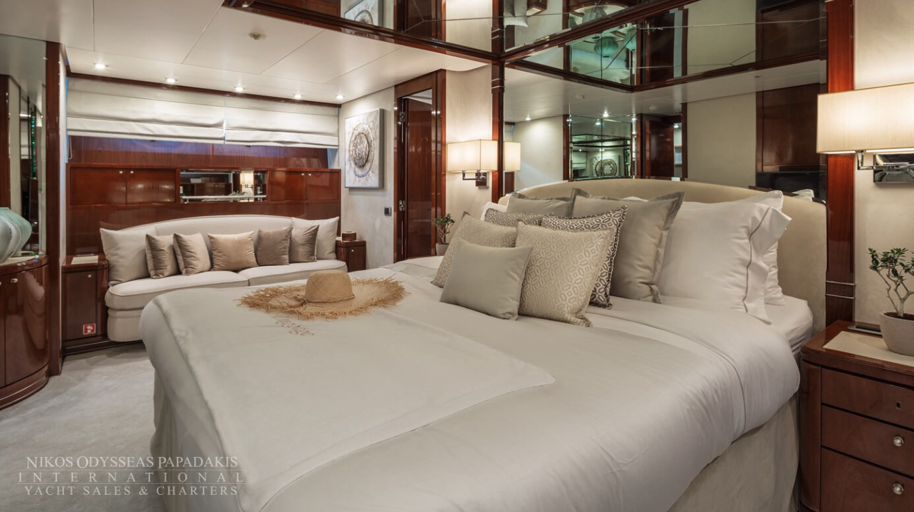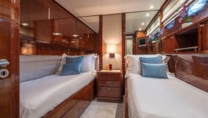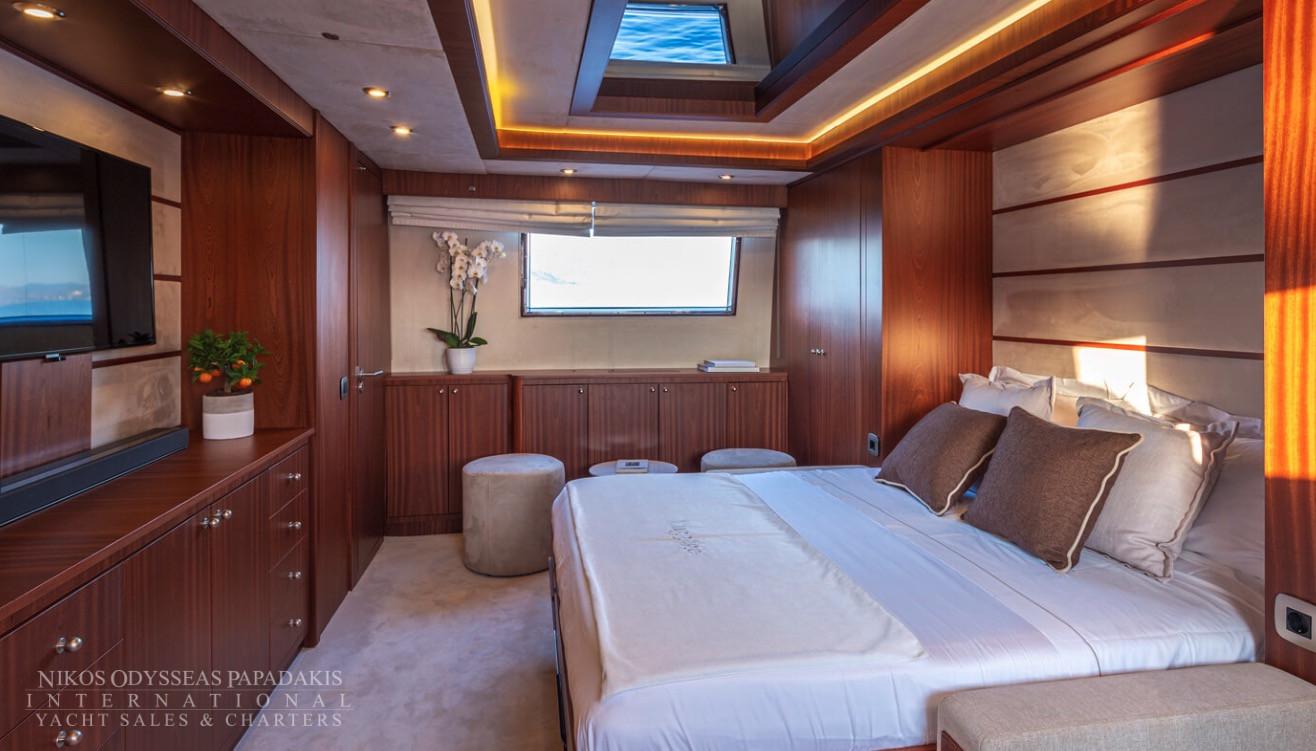 She accommodates up to 11 guests in luxurious cabins: one master, one double, and two twins with Pullman berths each on the lower deck, plus a convertible double cabin/playroom on the main deck—all featuring ensuite facilities for ultimate comfort.