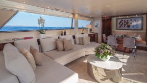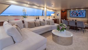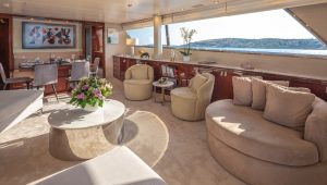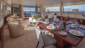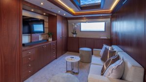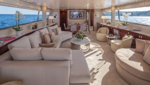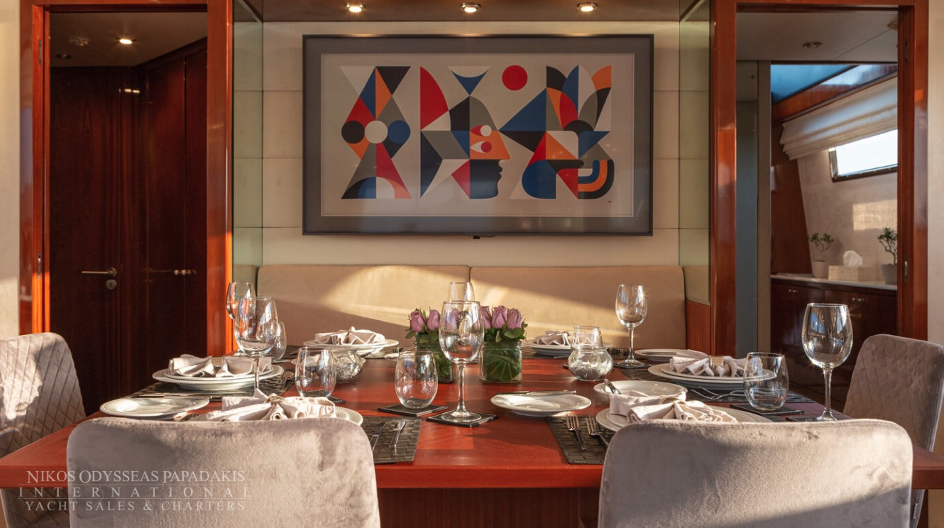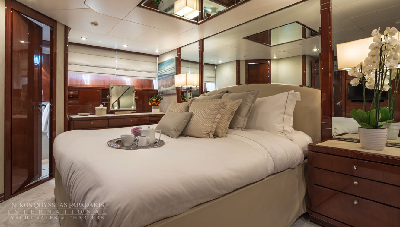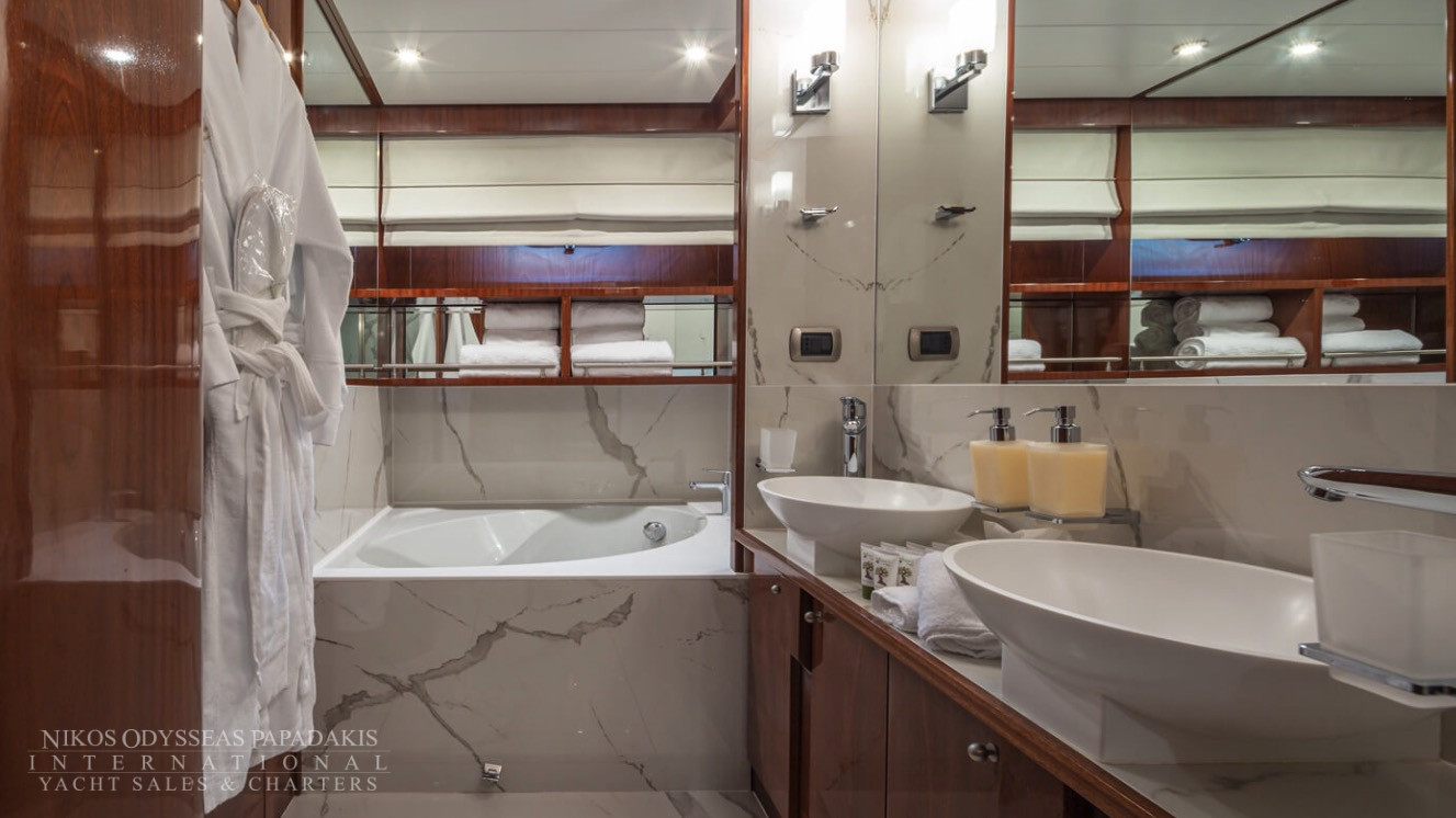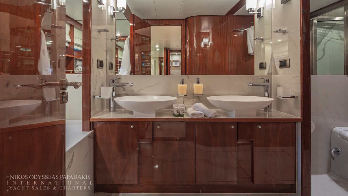 She accommodates up to 11 guests in luxurious cabins: one master, one double, and two twins with Pullman berths each on the lower deck, plus a convertible double cabin/playroom on the main deck—all featuring ensuite facilities for ultimate comfort.