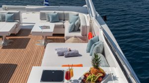 The charterer will be charged extra, at cost to the yacht, for all other expenses. These include fuel* for the yacht, fuel for the ski-boats or other tenders, food*, wine, beers, spirits and soft drinks for the Charterers (at retail super market prices), VAT (in Greece 11.5%) of the total yacht charter fee , other consumable stores, berthing dues and other harbor charges away from the yacht’s own berth, Corinth canal fees (if any), Private marine fees (if any), including pilotage fees and chargers for water and/or electricity taken from the shore, laundry, communications, hire costs of special equipment placed on board at the request of the Charterer, Gratuities for the crew.