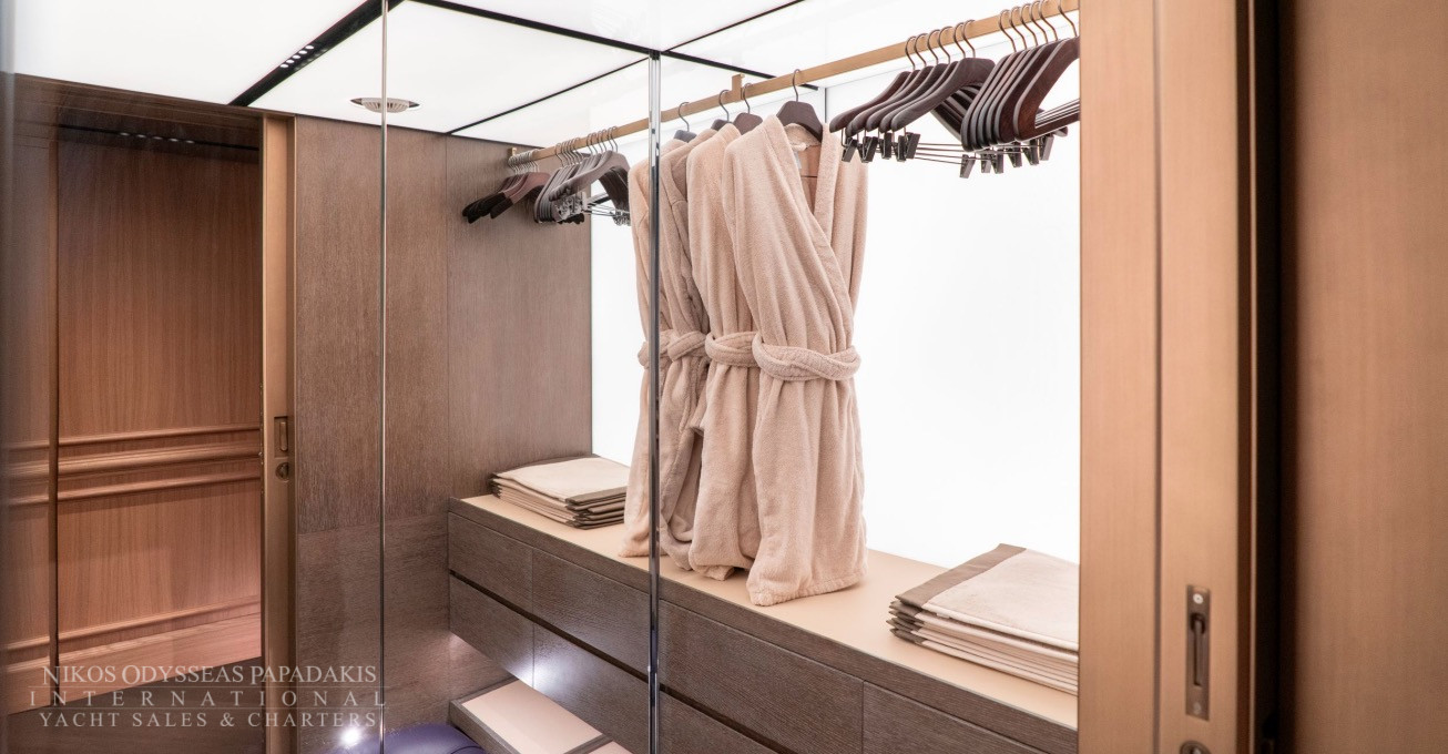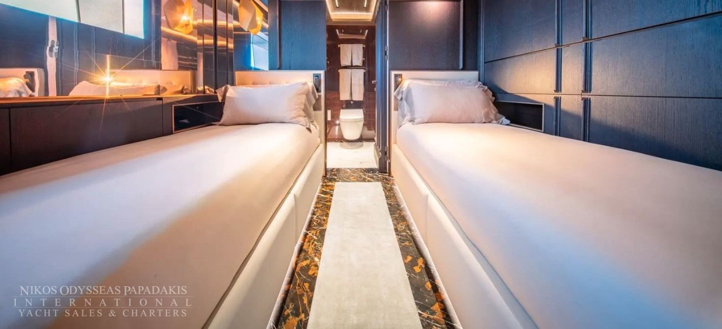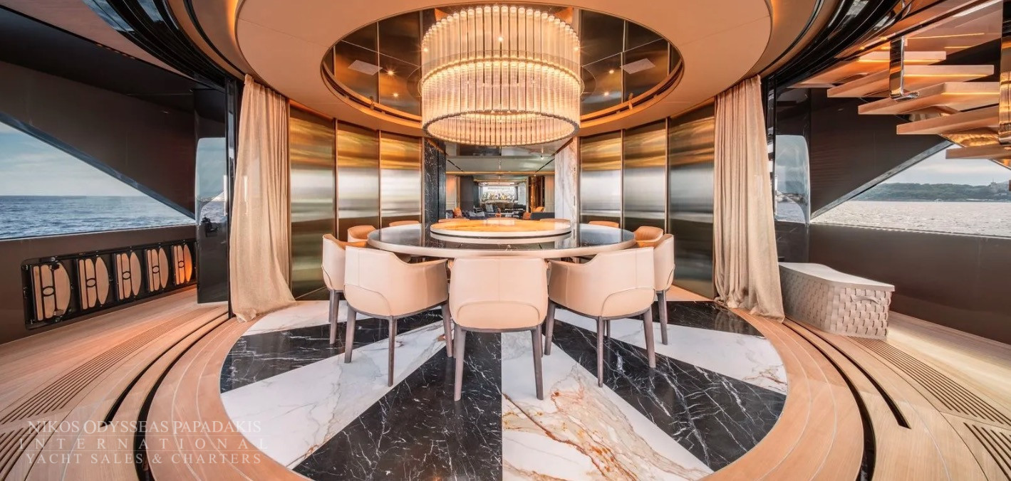 Her expansive exterior decks are thoughtfully designed for both entertainment and relaxation. From the sweeping sundeck with a gold-detailed mosaic swimming pool to the stylish beach club at water level, she invites you to immerse yourself in the yachting lifestyle. Whether you’re sipping cocktails at sunset or enjoying a private moment by the sea, every space is curated for memorable moments.