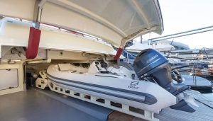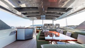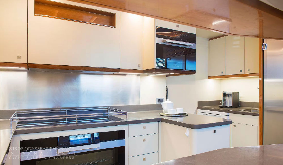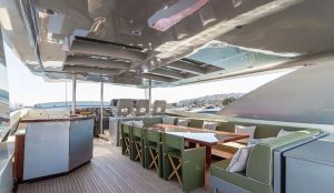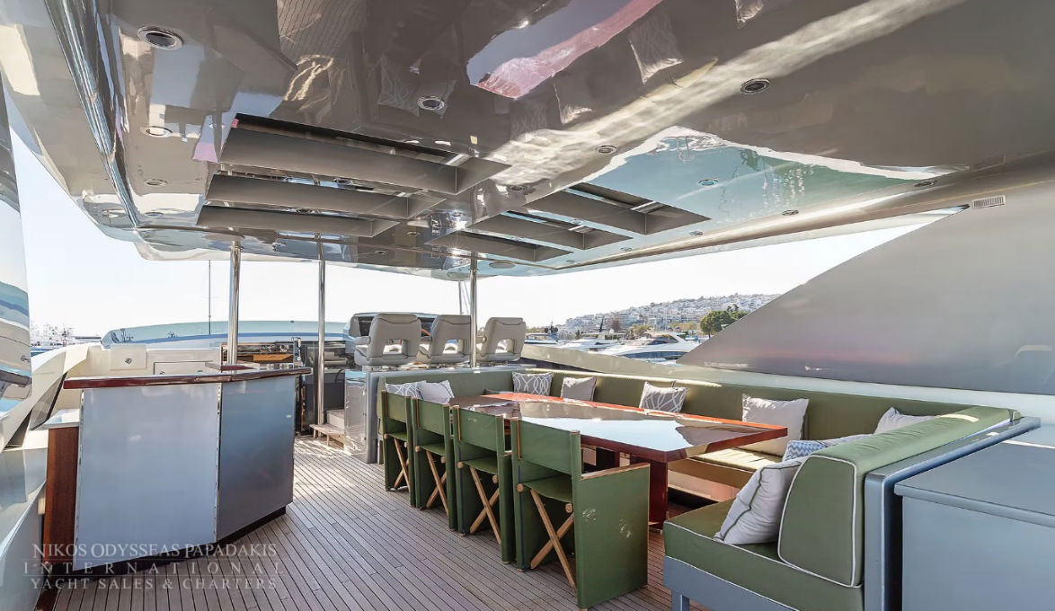 - On deck, she boasts versatile outdoor living spaces, including a spacious sundeck with Jacuzzi, a forward bow sunbathing area, and a well‑appointed aft deck seamlessly linked to her swim platform and tender garage.