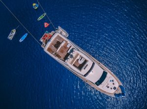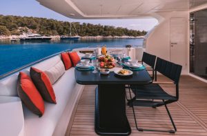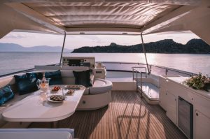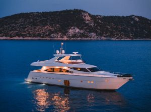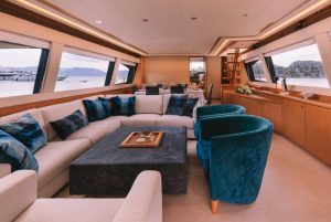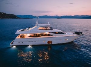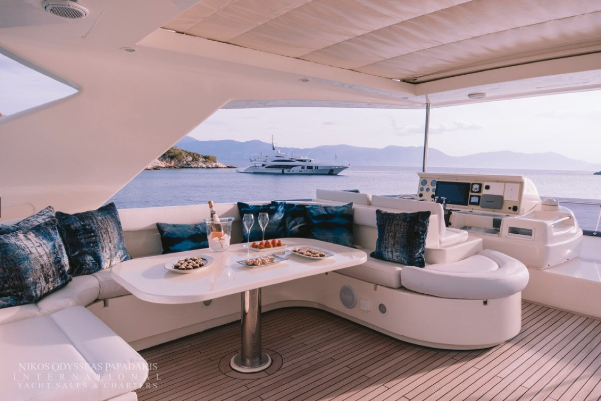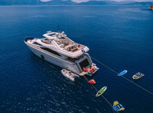 Her highlights include a full-beam master suite with floor-to-ceiling windows, zero-speed stabilisers, a beach club, and a spacious flybridge featuring a wet bar and an array of water toys.