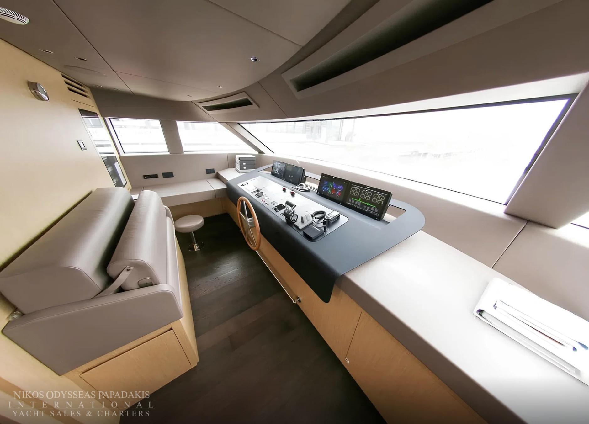 Accommodation is arranged for up to eight guests in four cabins, including a desirable main deck master suite, one VIP cabin, and two twin guest cabins. Bright, spacious social areas create an inviting setting for relaxed cruising, elegant entertaining, and uninterrupted enjoyment of the sea