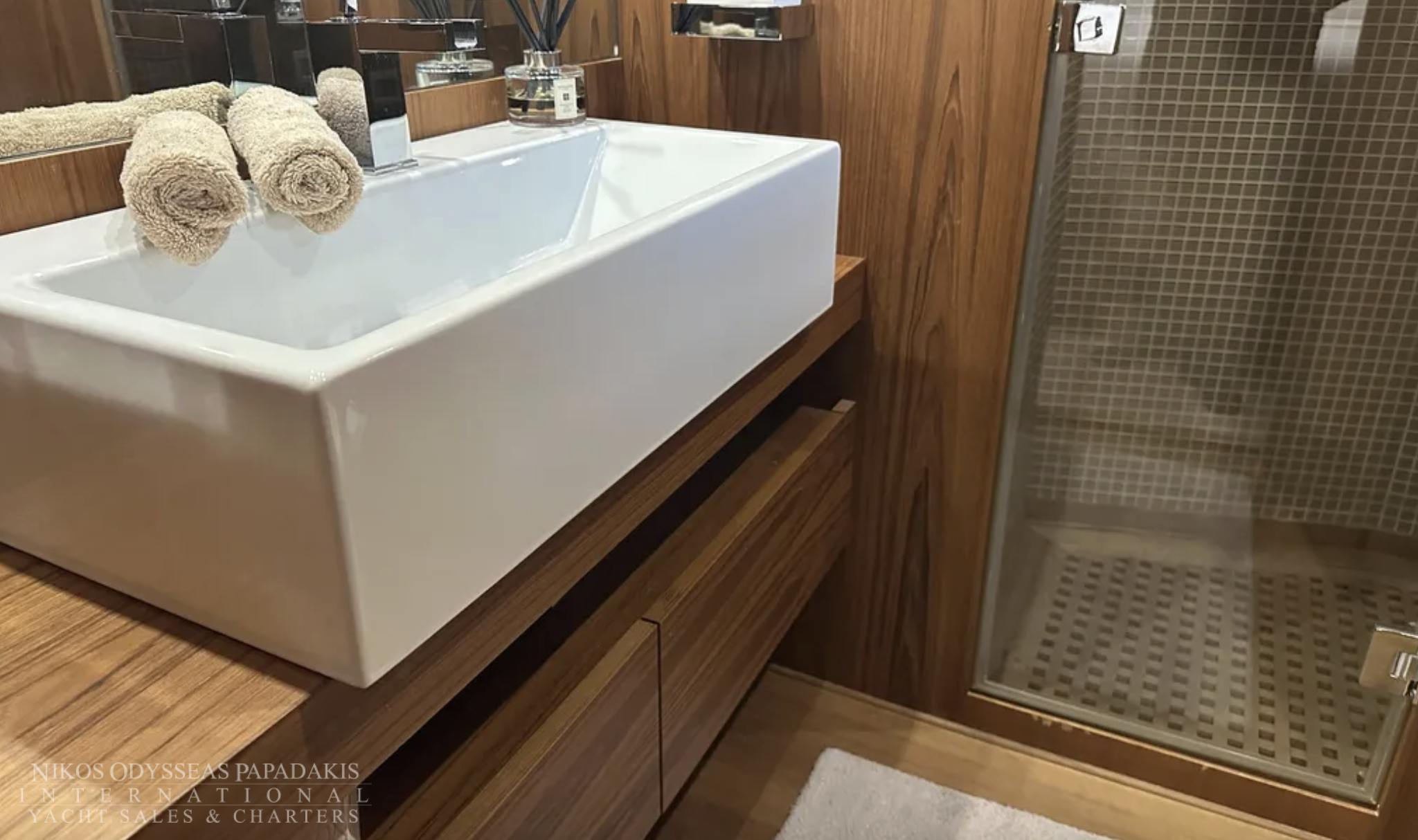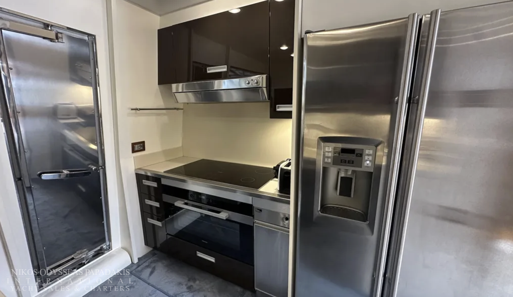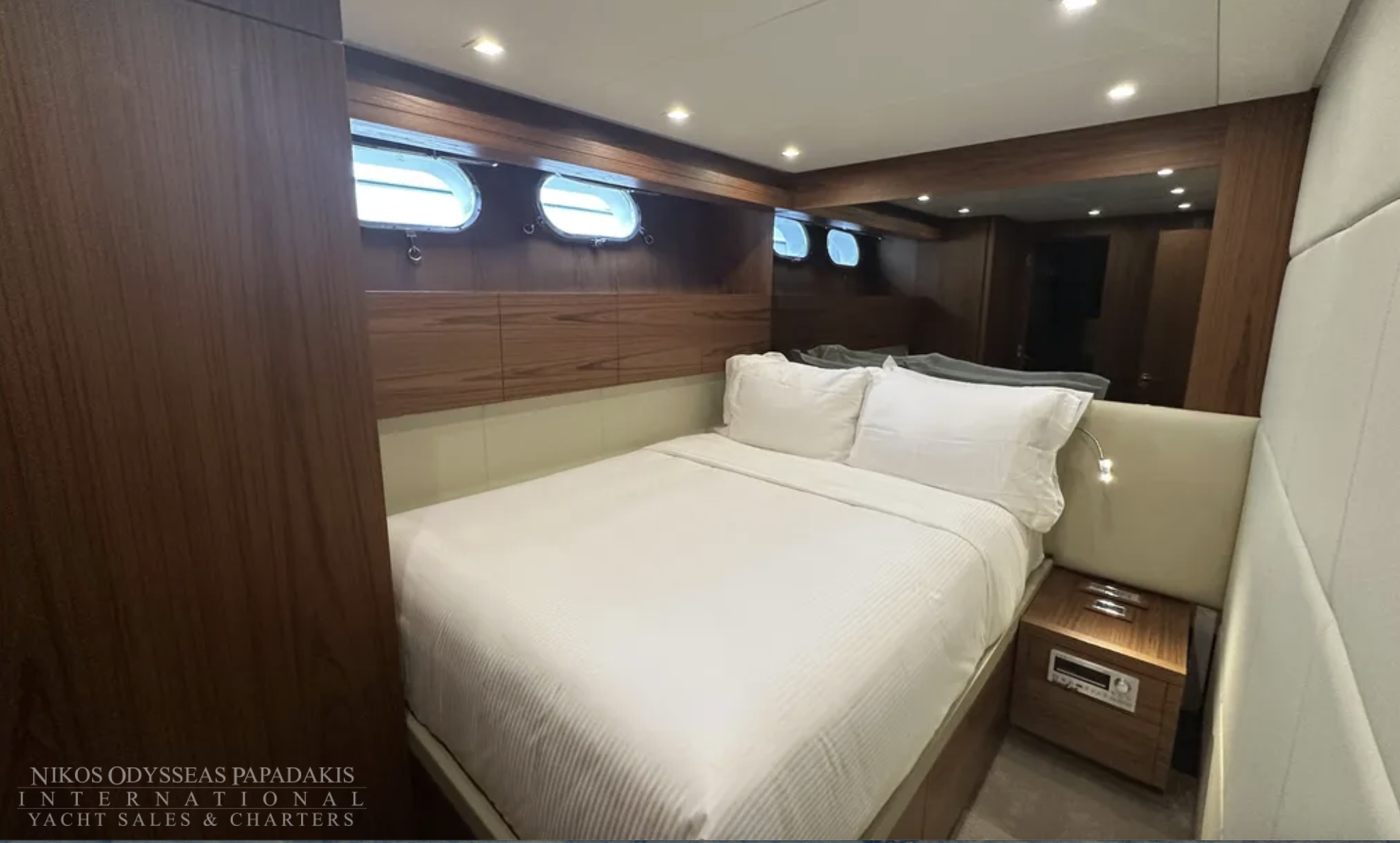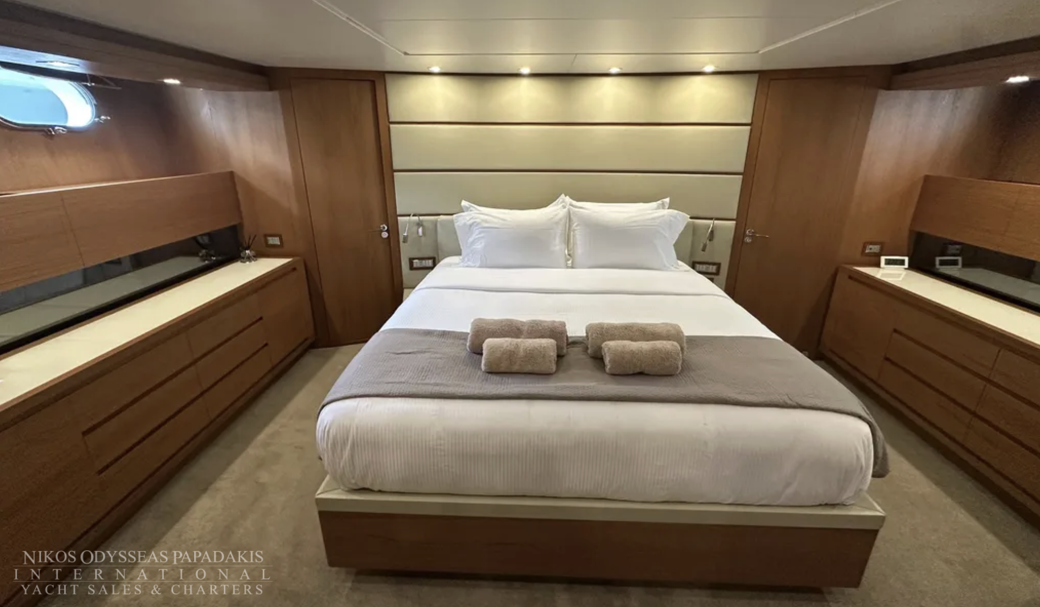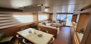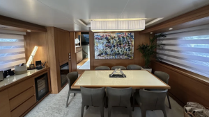 Key enhancements include a redesigned cockpit with a larger sofa, two new Mitsubishi gyro stabilizers, two new Onan 27 kW generators, refreshed interior styling featuring a new saloon sofa, dining table, and chairs, a brand-new Idromar watermaker, and upgraded electronics.