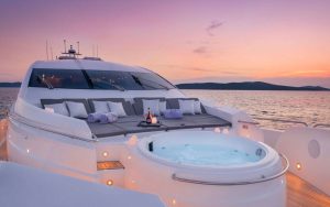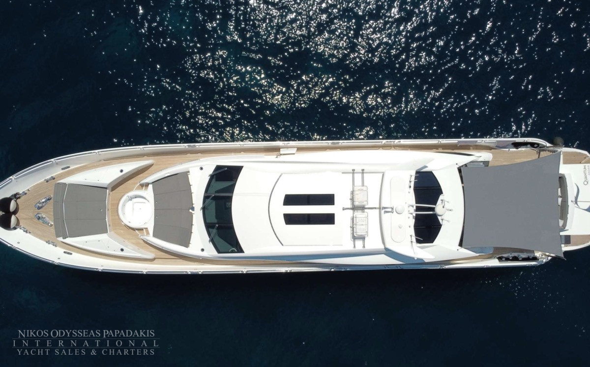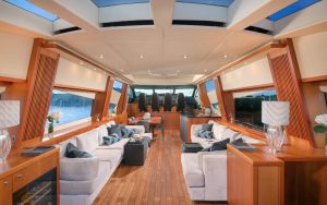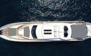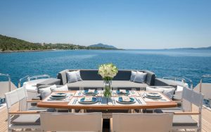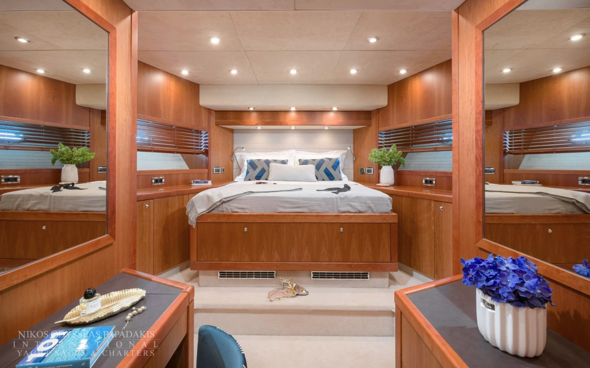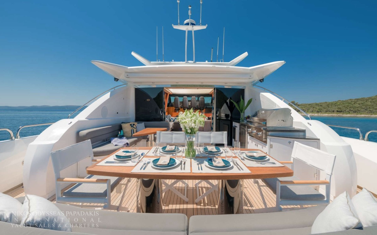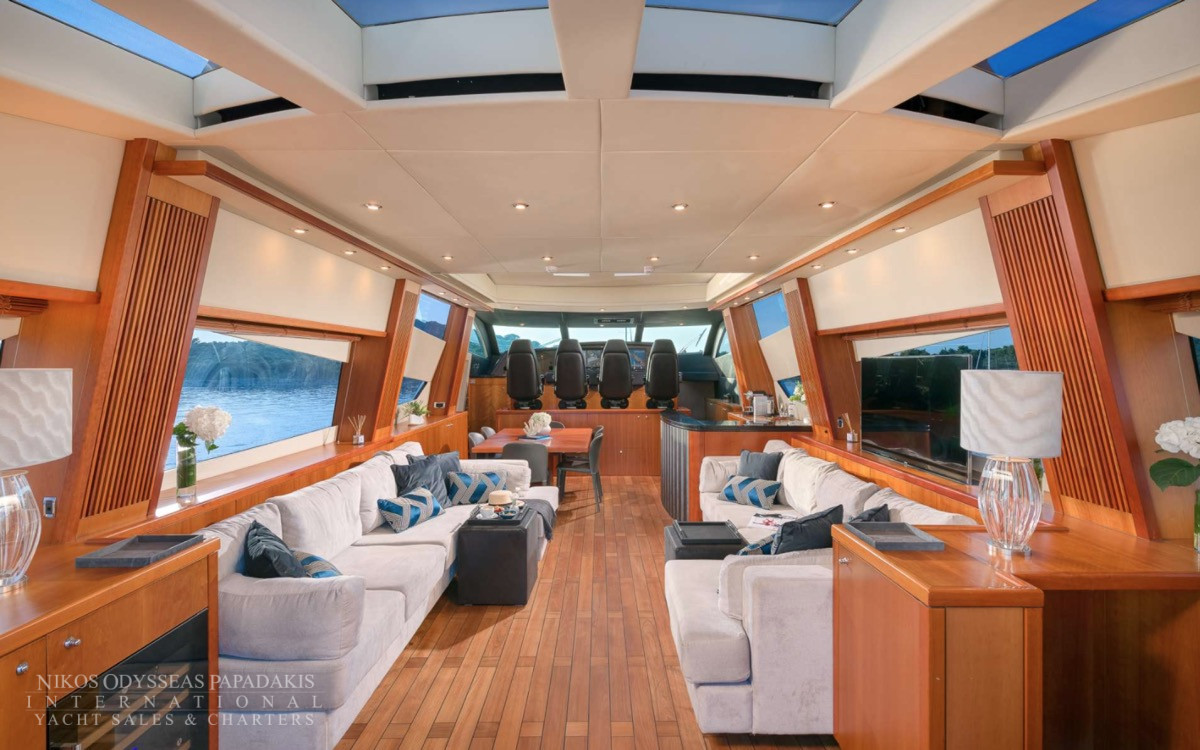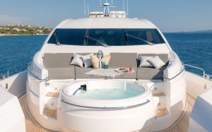Her outstanding outdoor areas are ideal for entertaining, featuring a Jacuzzi on the bow, a spacious aft deck with a fully equipped bar, and an advanced audio system that sets the tone for lively gatherings or relaxed sunset moments. The sliding hard top sunroof floods the main salon with natural light, creating a seamless flow between interior and exterior spaces.