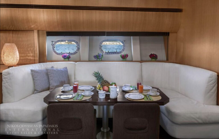 Experience the Aicon 64 for charter in Greece, a refined motor yacht offering inviting interiors, spacious decks, and a versatile layout ideal for families or mixed