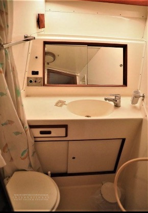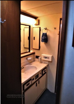 - As you enter the vessel through the sliding glass salon door your see an “L” shaped sofa to port. To starboard is the salon entertainment center. Forward, to port is the gourmet galley and across from the galley is a large dinette. Below decks to port is an island queen master. To starboard is the guest stateroom featuring upper/lower bunks. Forward is the VIP stateroom with an island queen berth. All staterooms have ensuite heads. The laundrey with washer/dryer is located in the companionway.