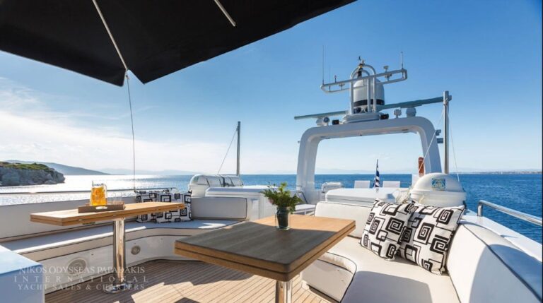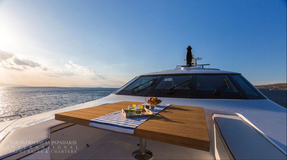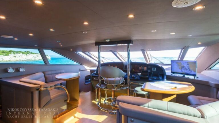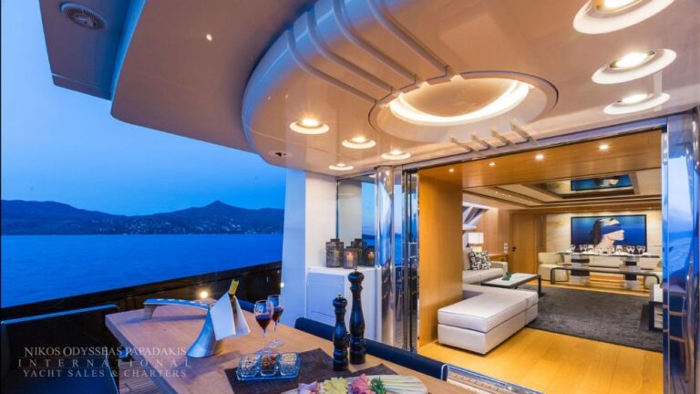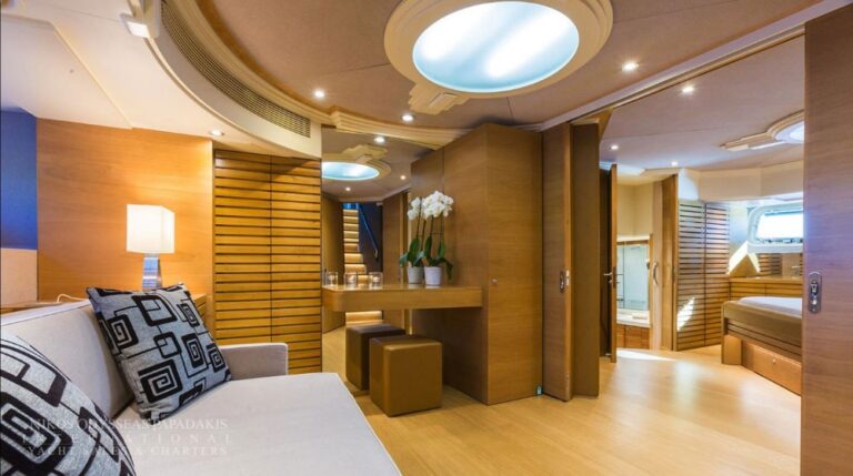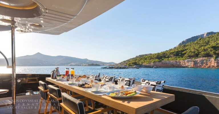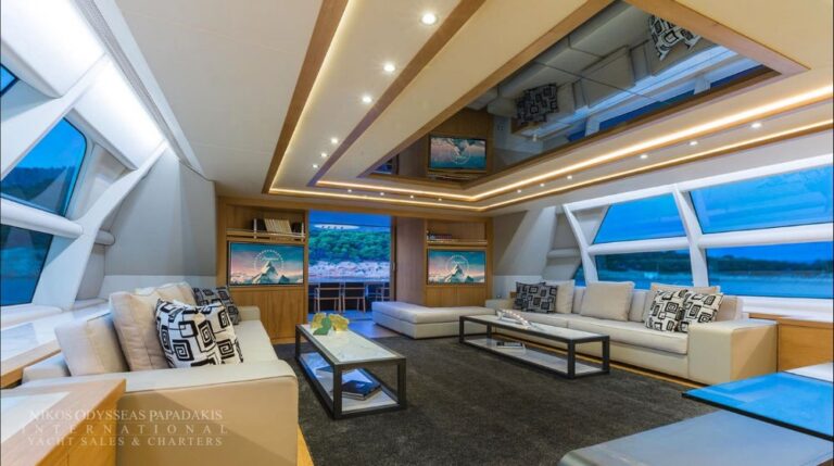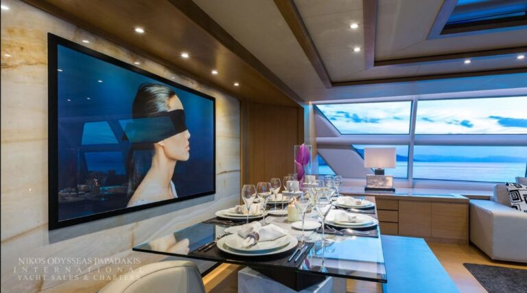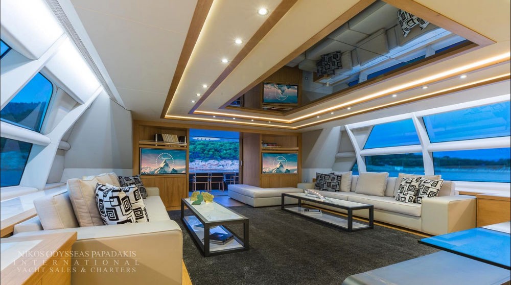 Designed with charter flexibility and private comfort in mind, her adaptable six-cabin layout comfortably accommodates up to 12 guests. The interior is defined by a sense of volume and light, anchored by a large open-plan main saloon featuring massive panoramic windows that bring the Greek coastline indoors.