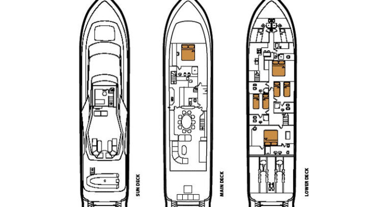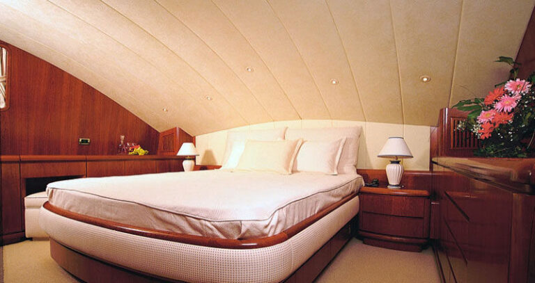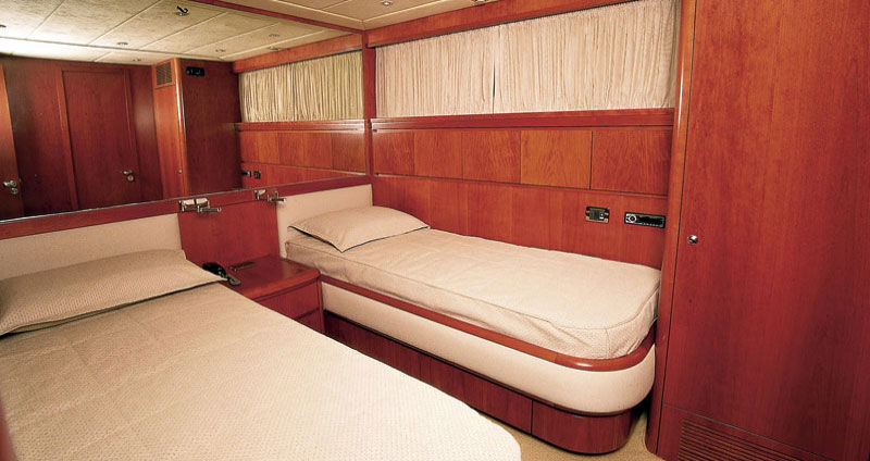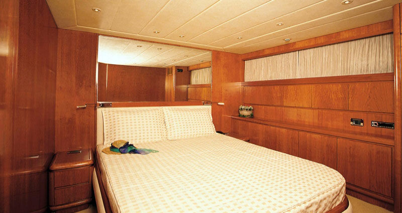 - One full beam VIP cabin on the main deck, features include a queen-sized bed, a large wardrobe, an en-suite bathroom, a writing desk, full air-conditioning, and integral audio/video systems.