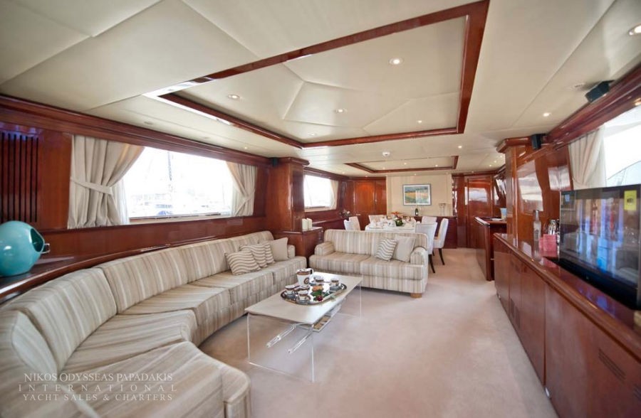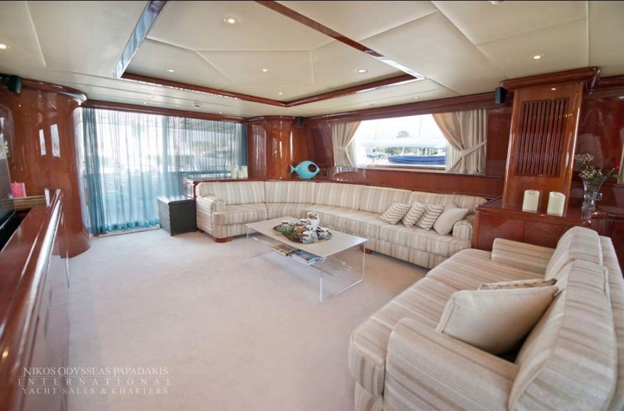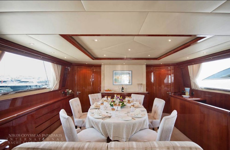 Her main salon features a loveseat, L shaped lounge, and retractable, flat screen T.V. Forward of the main salon there is formal dining with oval table and upholstered high back chairs.