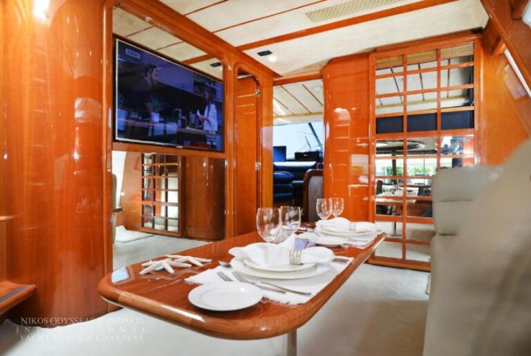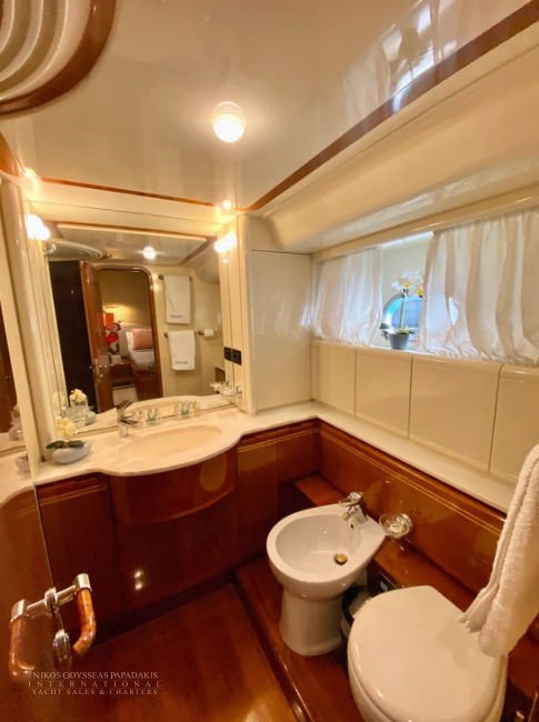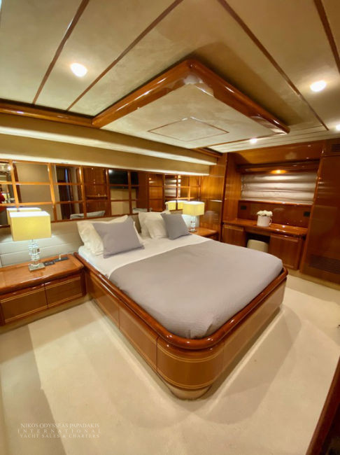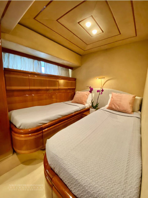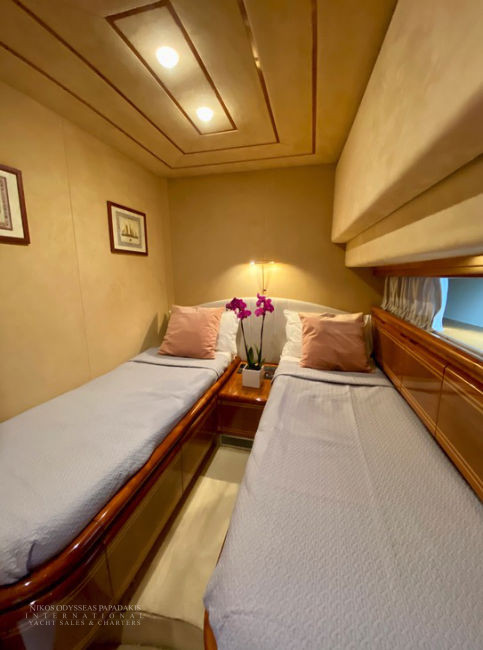 Accommodation for 8 guests in 4 cabins (one Master, one VIP, and two cabins with twin beds convertible to double beds, all with en-suite facilities), crew of 4.
