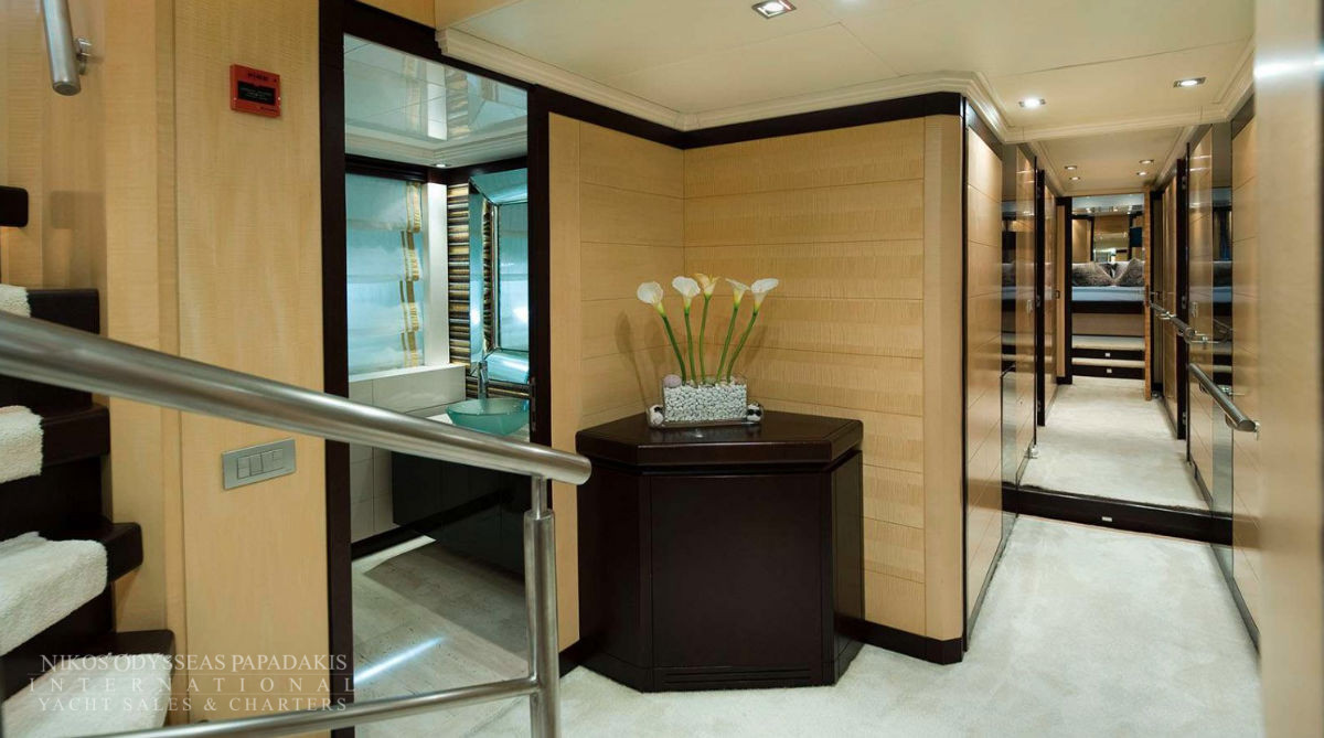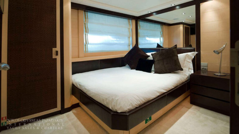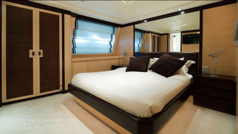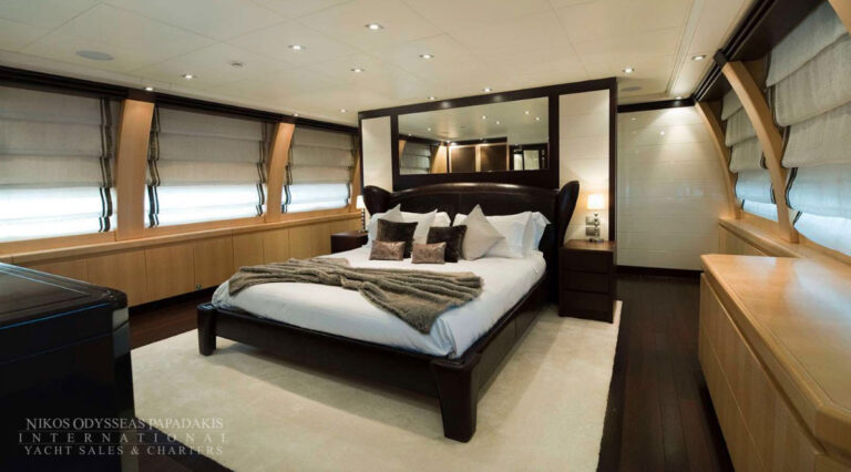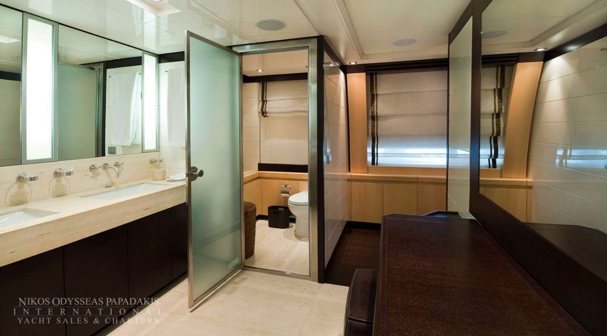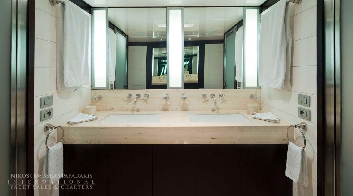 - The full beam Master stateroom is located on the main deck, with “his & her’s” en suite facilities.