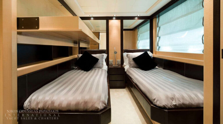 - Guests – Master stateroom, three VIP staterooms and one twin Crew 3 x double (twin beds), 1 x single (captain cabin) Guest cabins are located on the lower deck, all with en suite facilities.