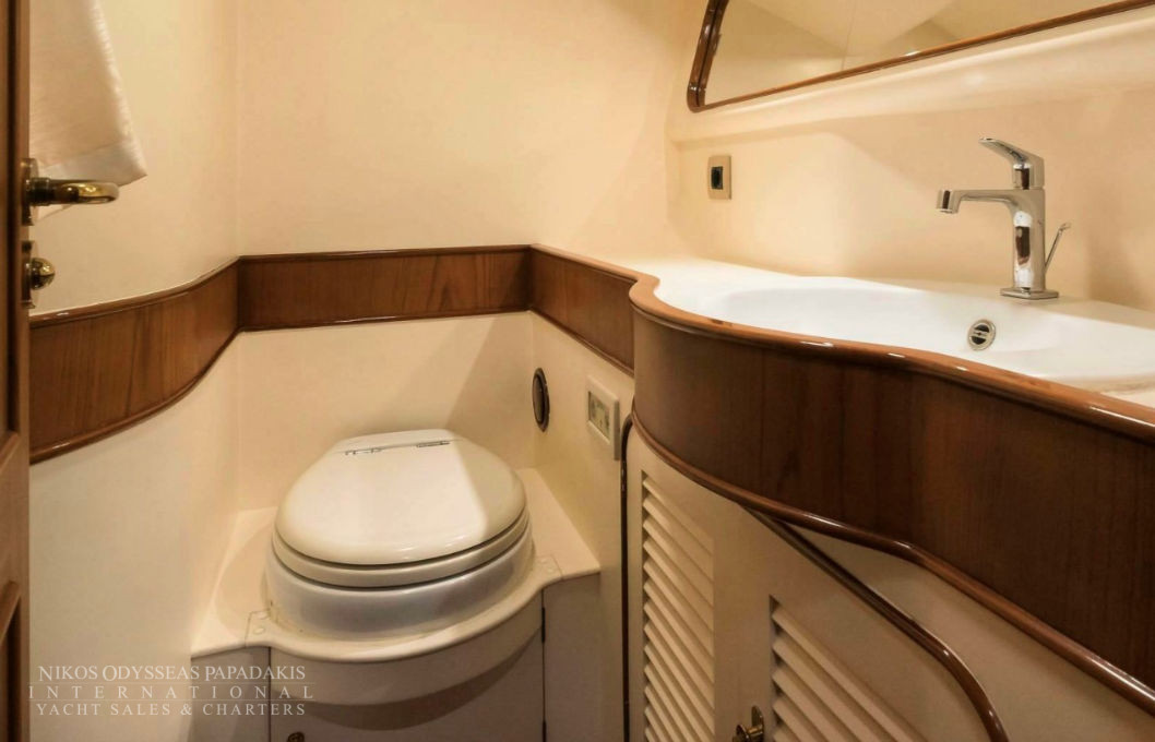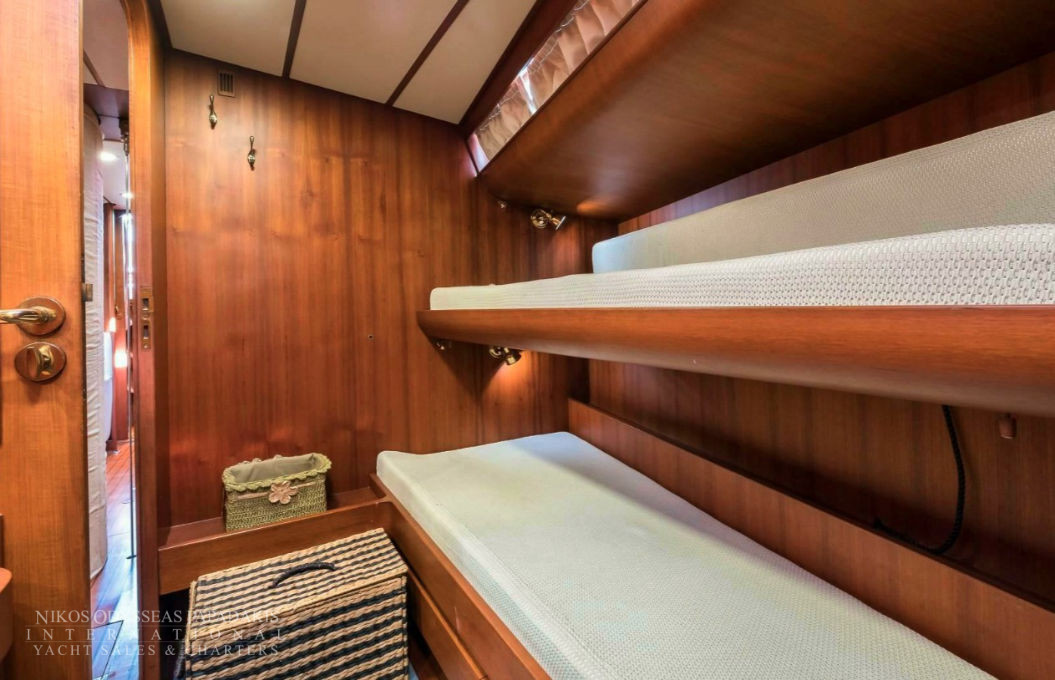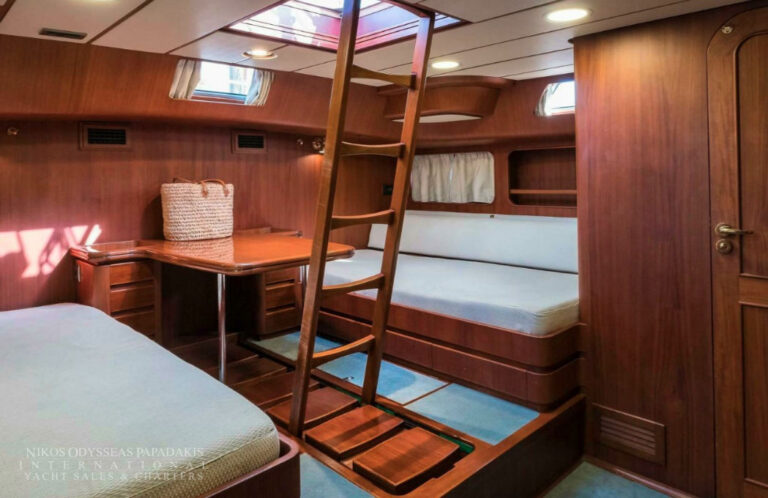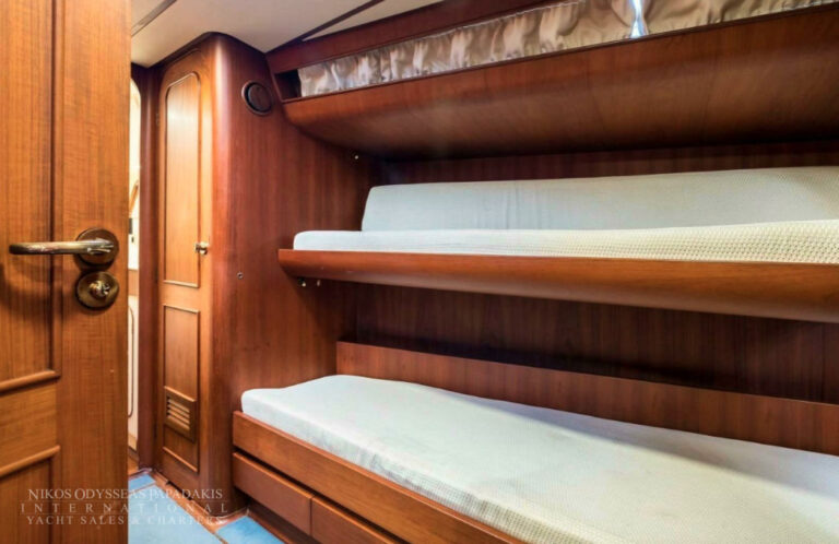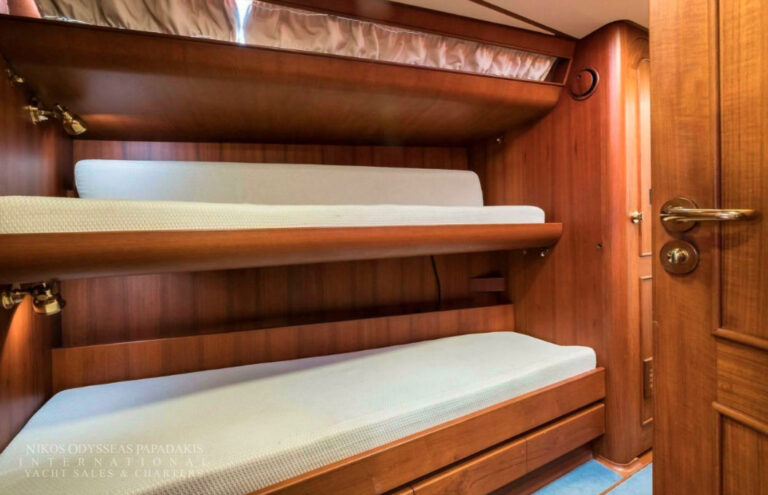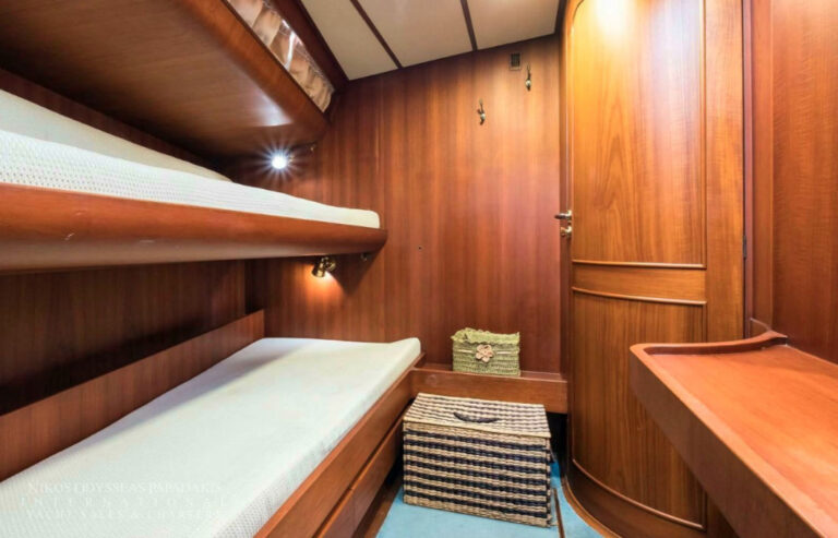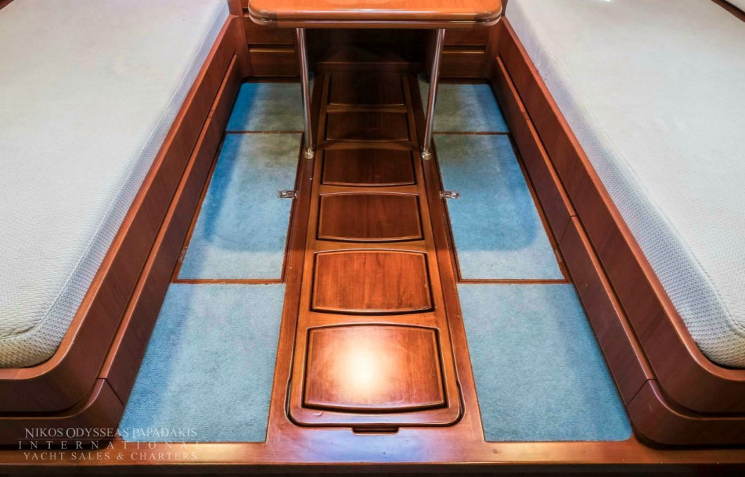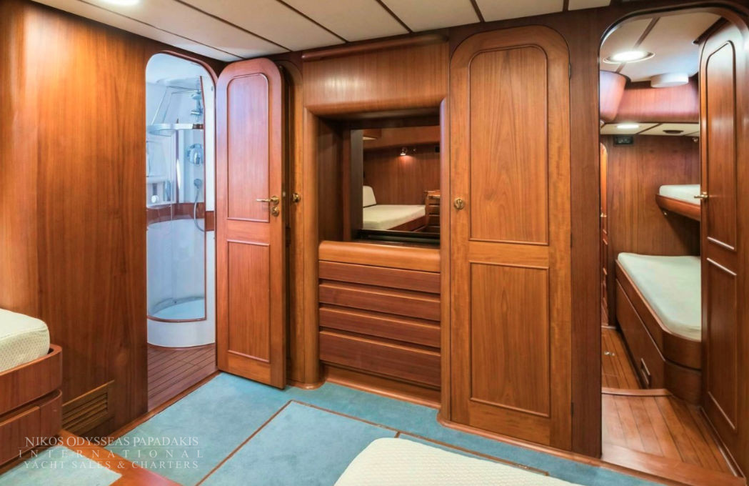 - The aft guest cabin is located next to the owners cabin and has two doors, one to access from the corridor and, another one to access directly from the Owners cabin, therefore ideal for children. The door that communicates with the owners cabin is double paneled, to provide extra privacy when closed.