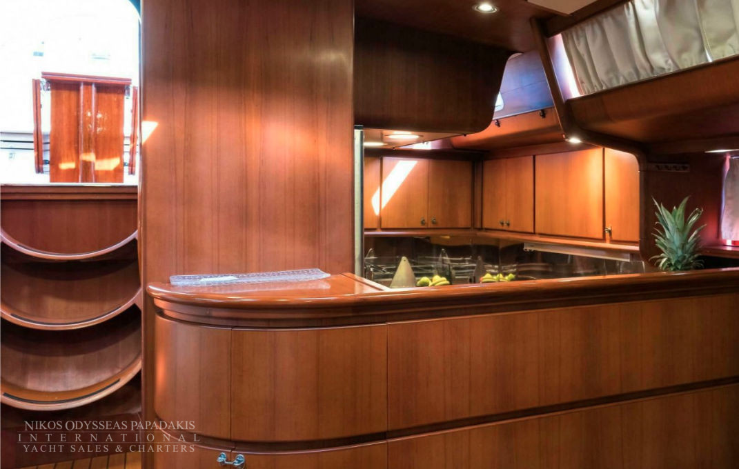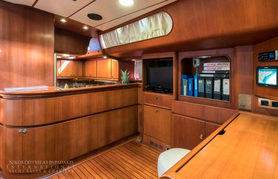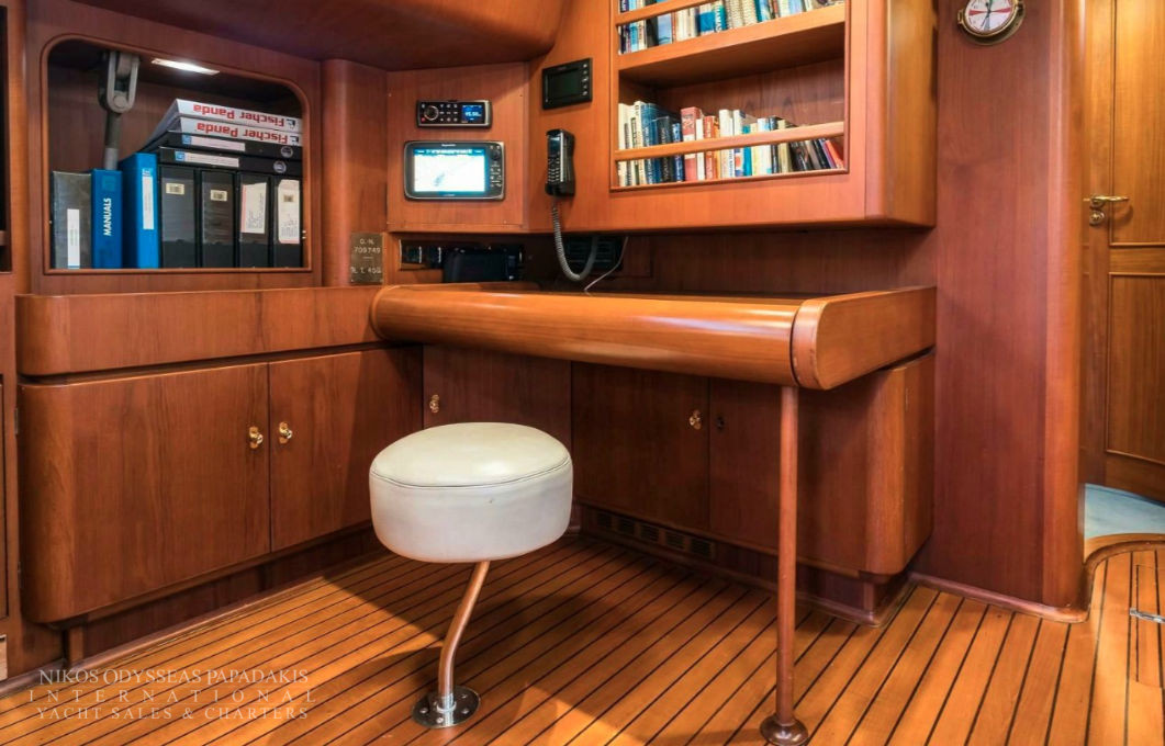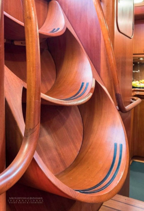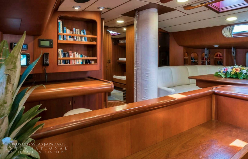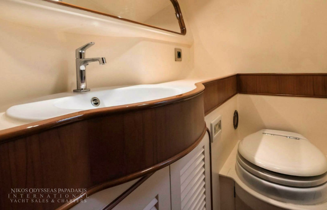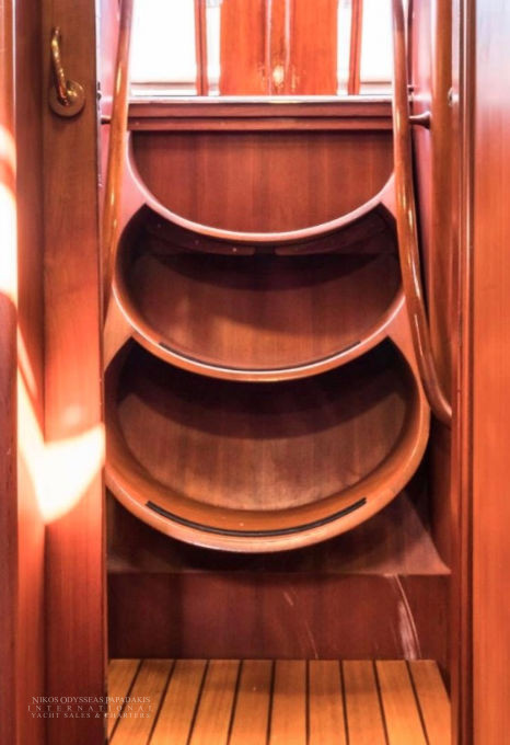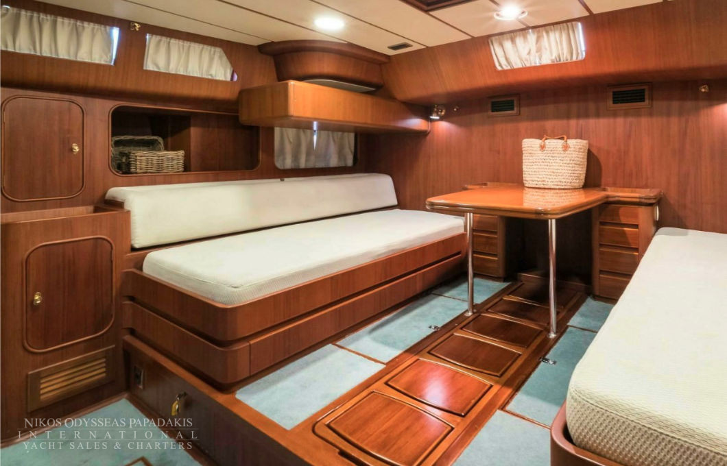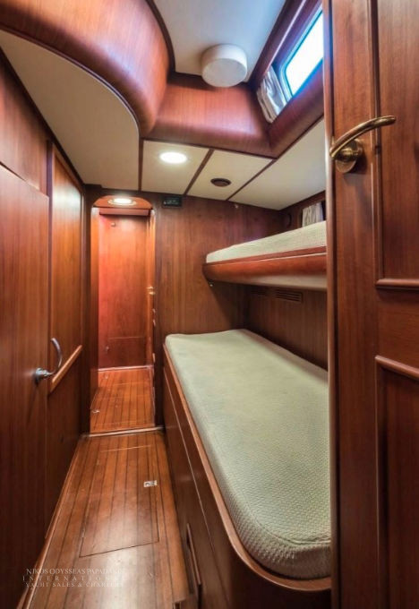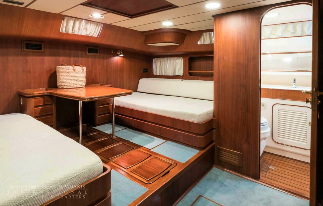 - Owners cabin:Full beam. Located aft, with twin beds (fixed) each side. All in teak. En-suite bathroom with round shower.