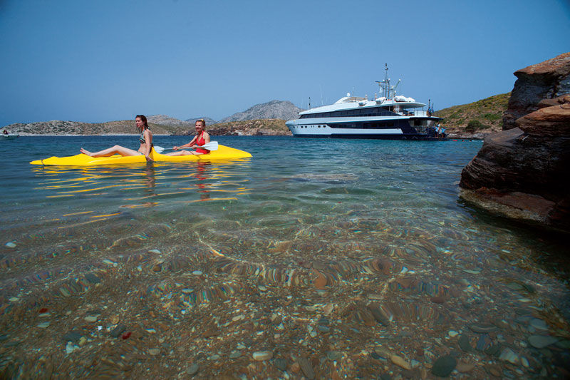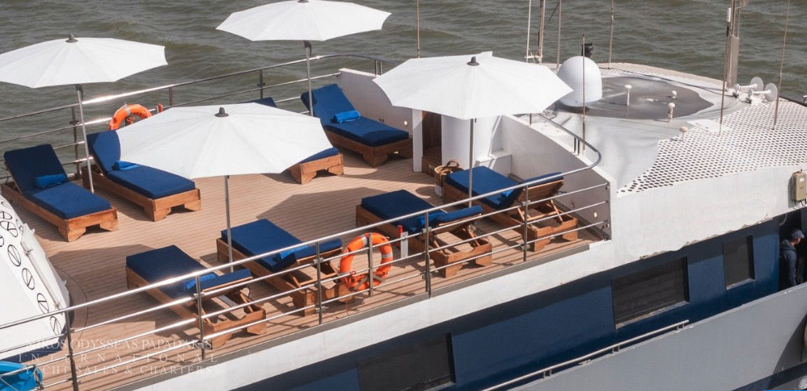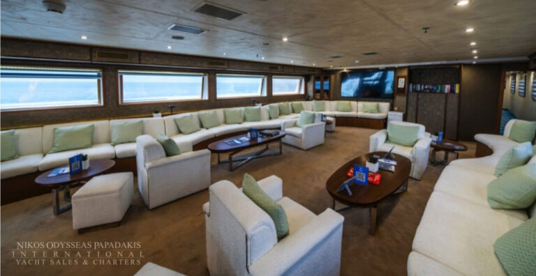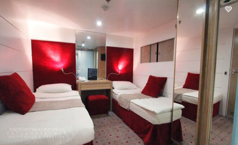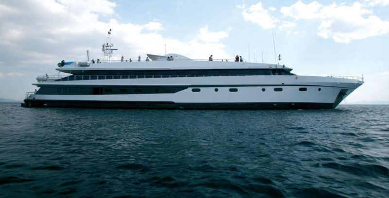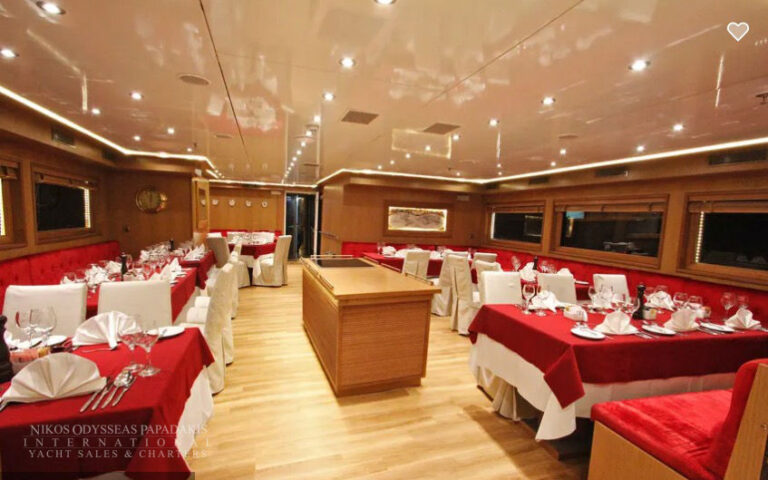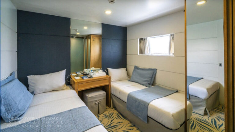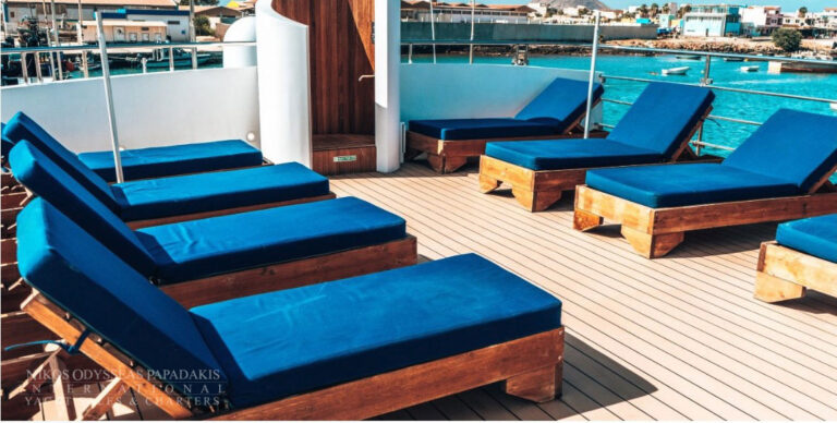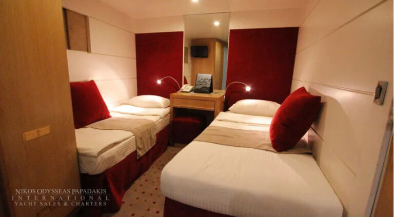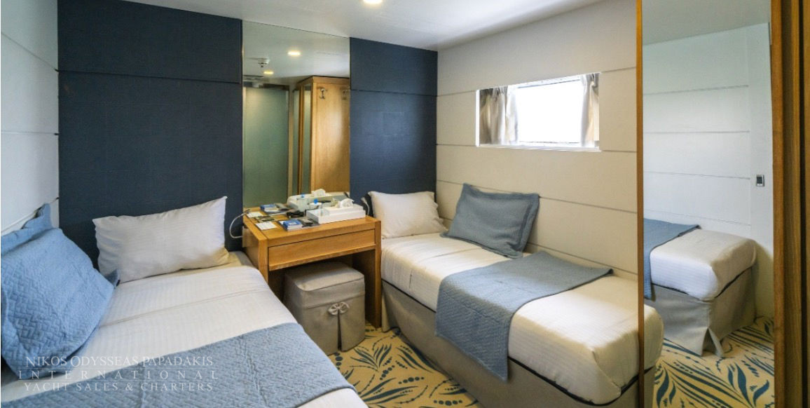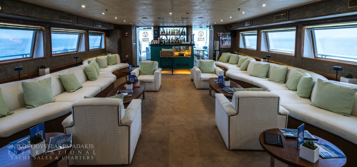 Mini Cruise Ship 54m launched in January 2001, renovated in 2023 and classified by the latest International Safety of Life at Sea (SOLAS) standards. Mini Cruise Ship 54m can accommodate 44 Guests in 21 Ocean View Cabins, while its powerful engines and state of the art stabilizers allow for safe and comfortable cruising. Spacious lounge, dinning areas with large windows offering pristine views, shaded outdoor areas, outdoor bar and loungers are just some of the elements that define her essence.