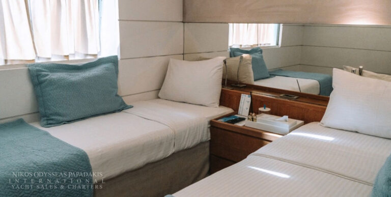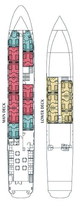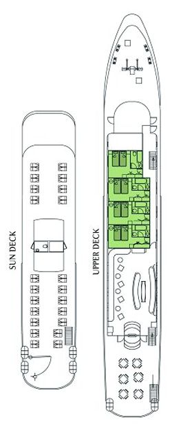 - Main deck : 11 cabins (twin lower bed cabins)