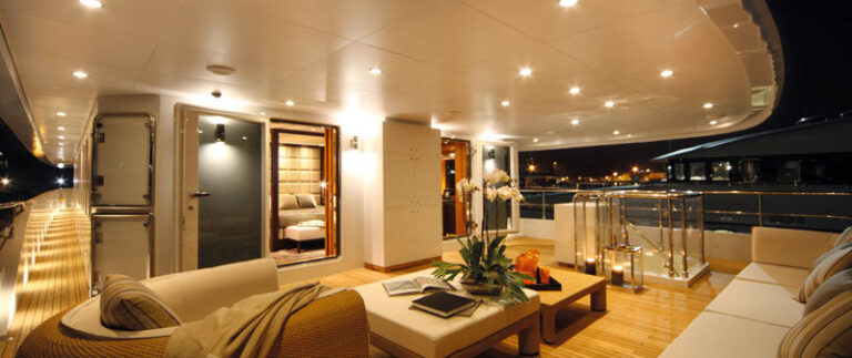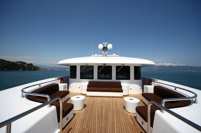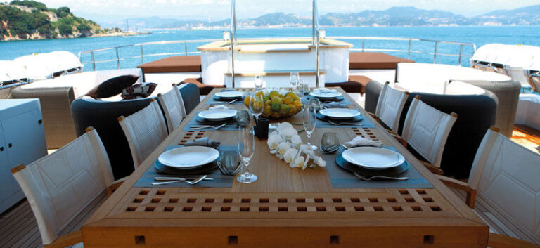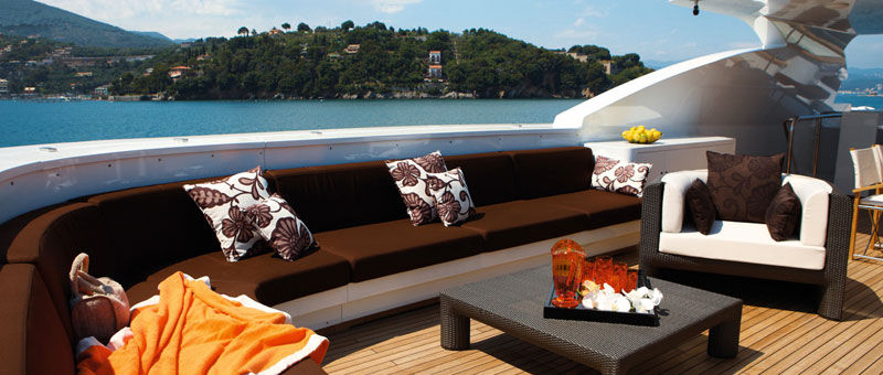 Mondomarine 162ft. offers plenty of exterior space on 3 decks; The main deck features a large shaded aft deck with comfortable seating on 3 cushioned settees with coffee tables, the upper deck offers many options for sunning and relaxing on the many comfortable seating choices and sunpads, the deck also includes a large Spa Pool and an alfresco dining option. While the second deck is reserved for the exclusivity of the master cabin and features a private seating area.
