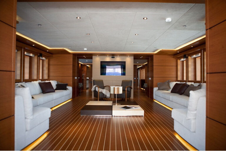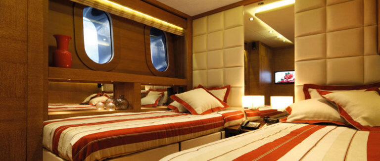 Her layout comprises two full beam master staterooms of identical size. One of the master suites is located on the main deck forward, whereas the other can be found on the upper bridge deck. The latter features direct access to the exterior deck. The remaining accommodation includes two double cabins and two twin cabins, all four located on the lower deck.