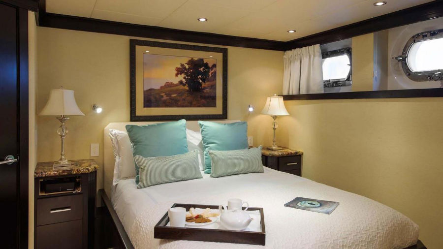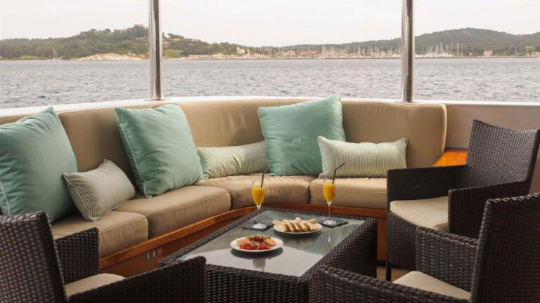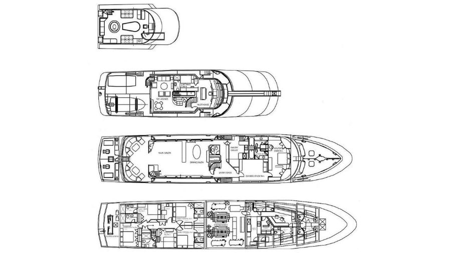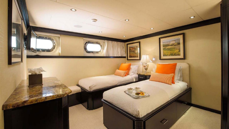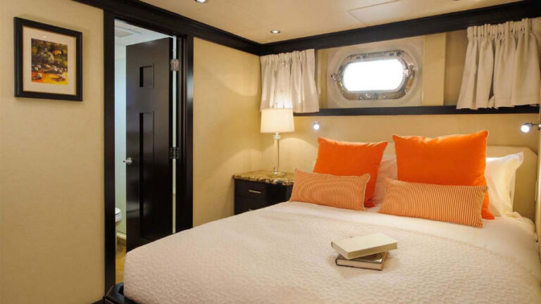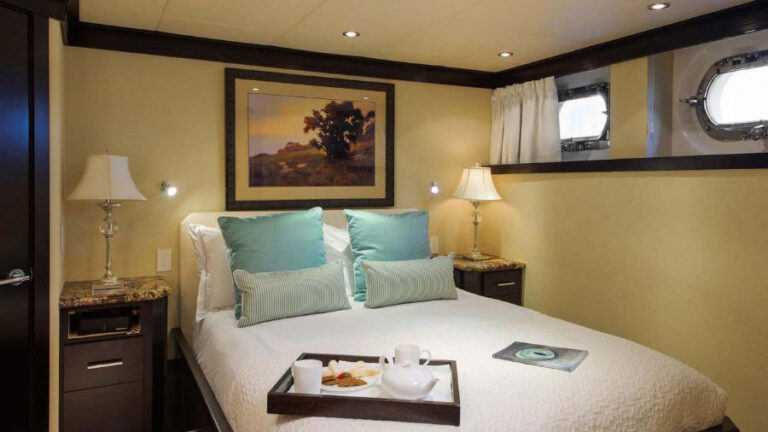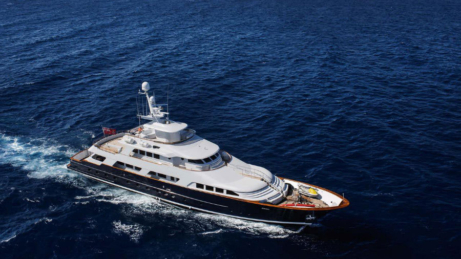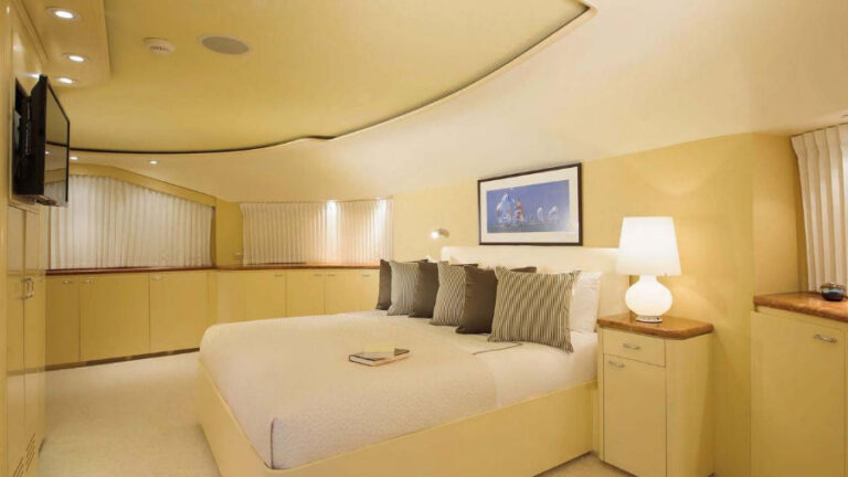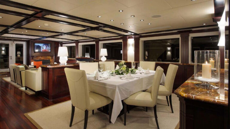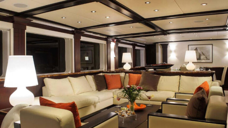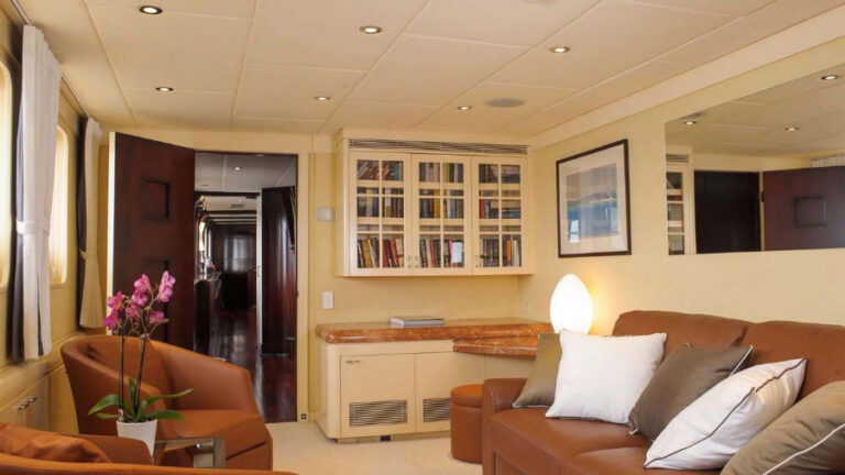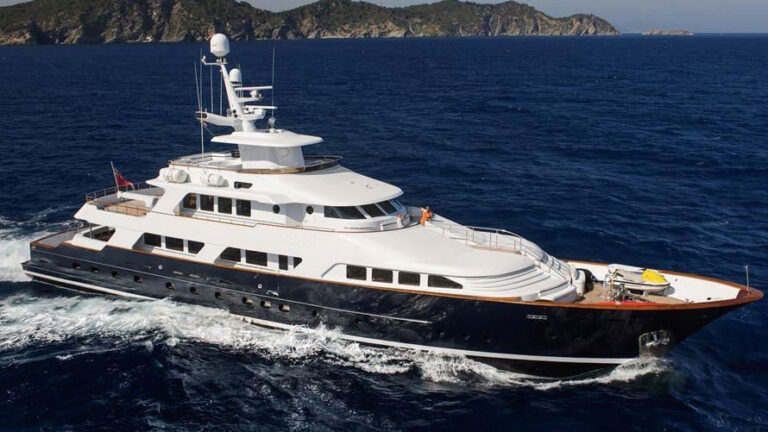 Nishii Zosen – Sterling 143ft. ABS certified and MCA compliant.  Subsequent refits in 2017, 2019, 2020 and 2022 have ensured this tri-deck vessel was maintained to superlative standards. Her most recent refit works included new Caterpillar main engines in standard TIER III and new Caterpillar generators, which are still under warranty, a hull and superstructure repaint, various technical upgrades, and aesthetic enhancements inside and out. Nishii Zosen – Sterling 143ft. features spacious lay out, accommodation for 12 guests in 6 cabins.
