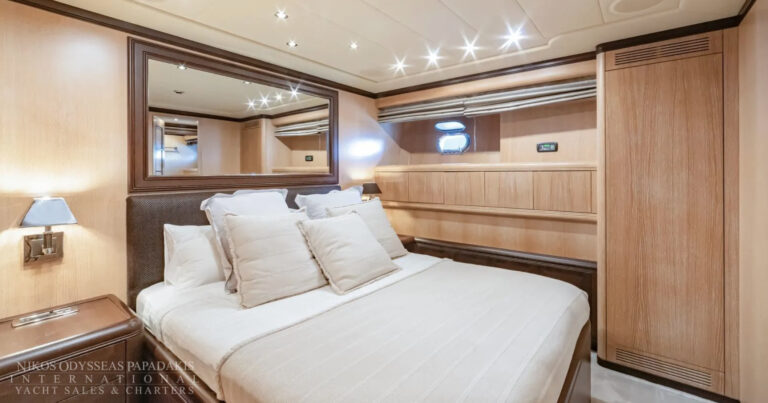 Her interior blends sleek style with comfort, featuring state-of-the-art entertainment systems and premium bespoke furnishings that create a refined onboard atmosphere. Accommodation is arranged for up to 11 guests in 4 beautifully appointed cabins, offering flexibility for both private cruising and charter use.
