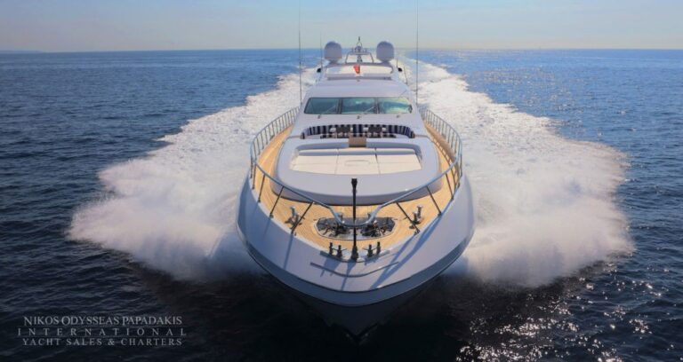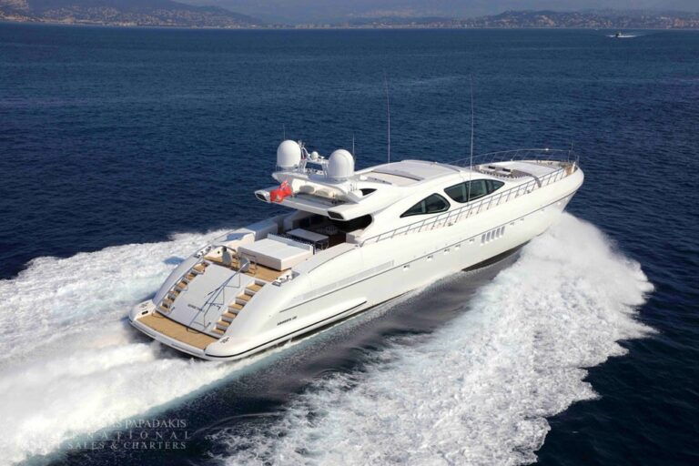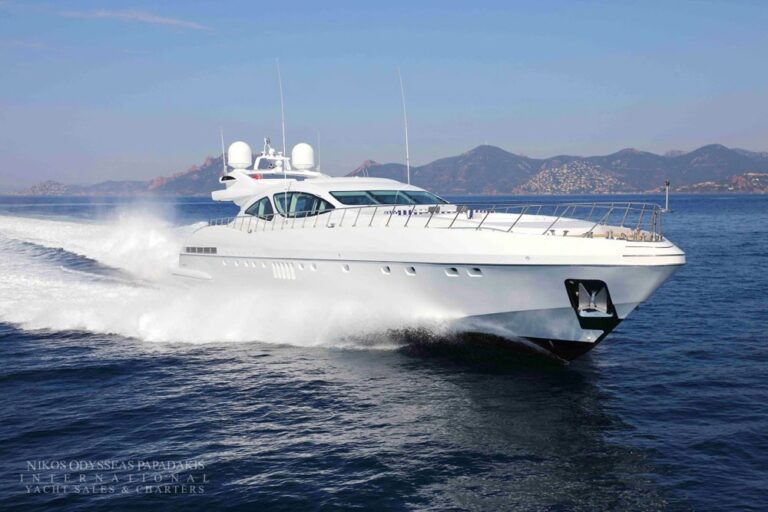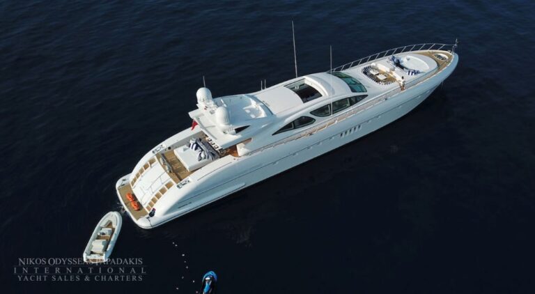 Overmarine Mangusta 130 for sale. An impressive Open Style performance yacht significantly refitted in 2019 including a full paint job as well as a refresh to the interior with new flooring and furniture. Accommodation for 12 guests in 5 cabins. Equipped with 2 x 3750 hp MTU engines. Maximum speed 32 knots. Turn key condition. VAT paid.