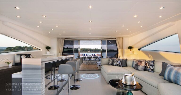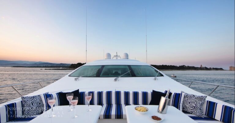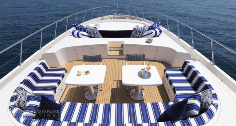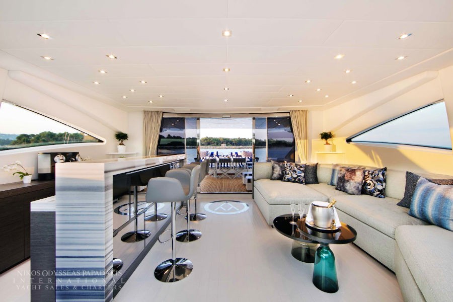 Experience the Aicon 64 for charter in Greece, a refined motor yacht offering inviting interiors, spacious decks, and a versatile layout ideal for families or mixed