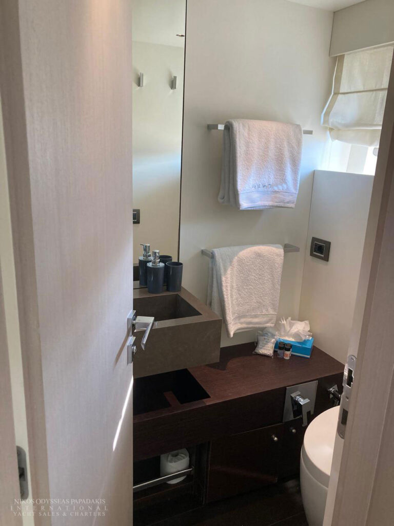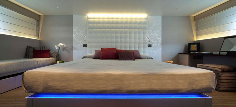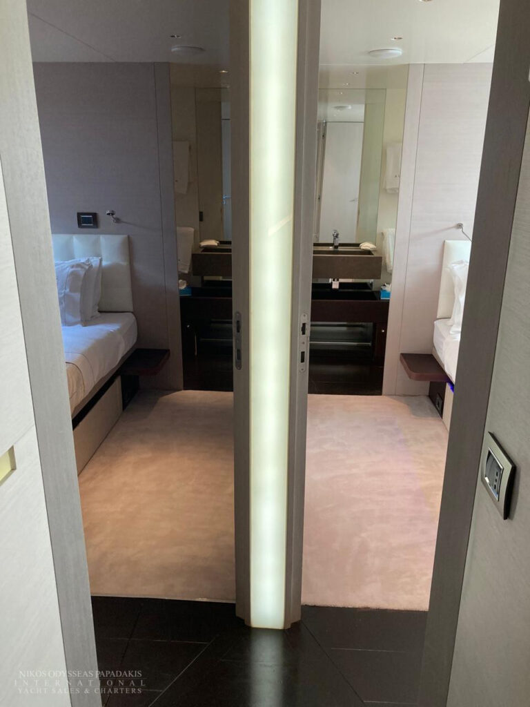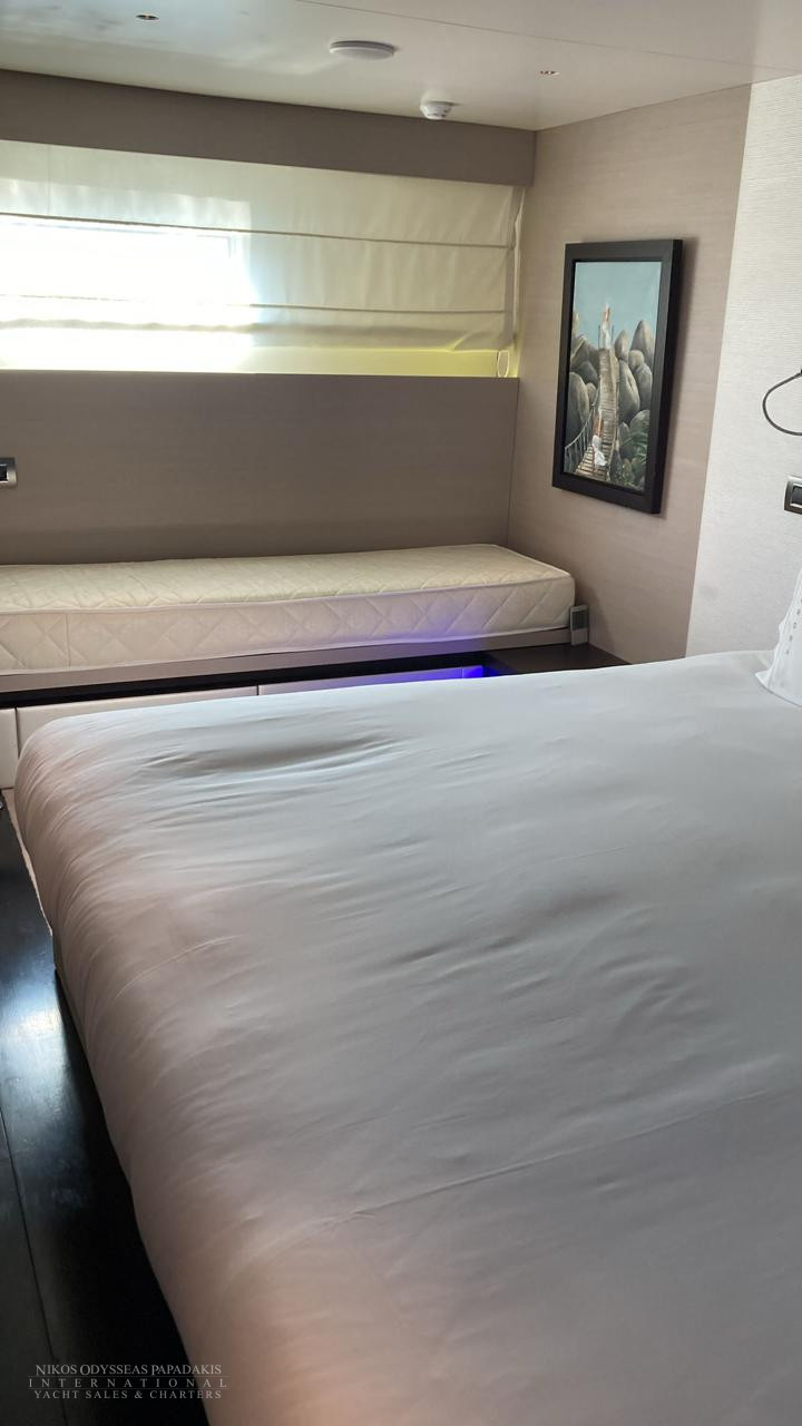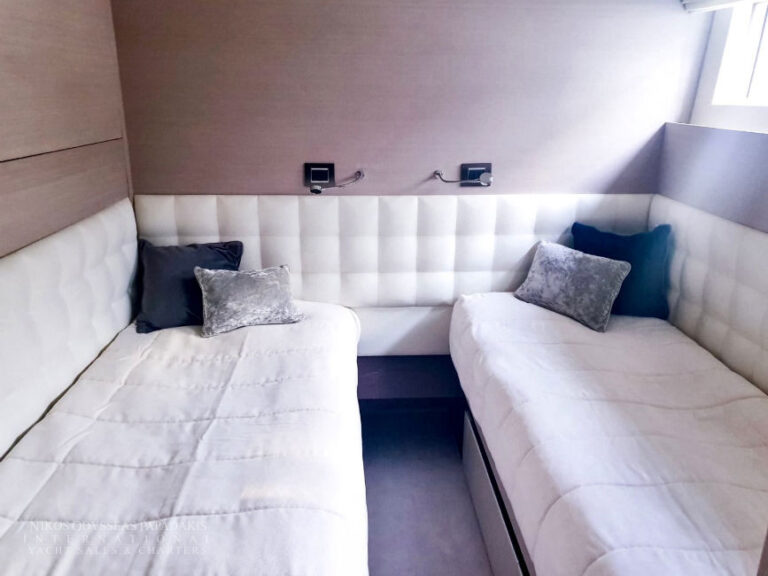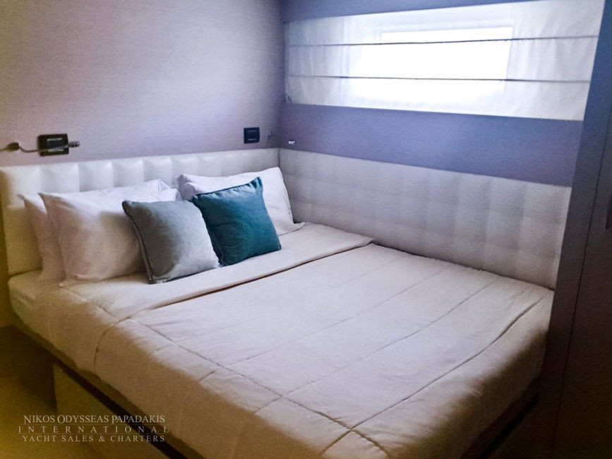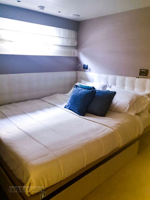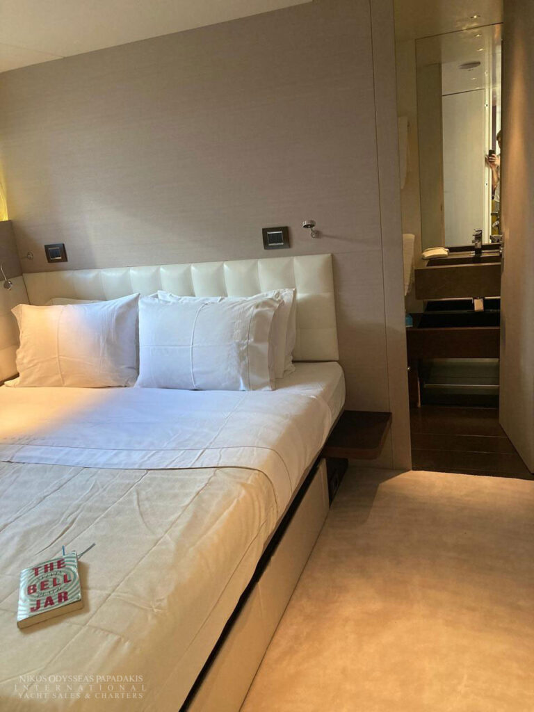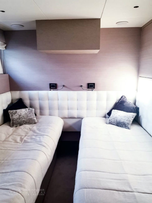 • 5 cabins on the lower deck include the full beam master suite, 2 doubles and 2 twin cabins with pullman beds, which can be accessed through the central main staircase. The single beds in the twin cabins can be converted into double beds.