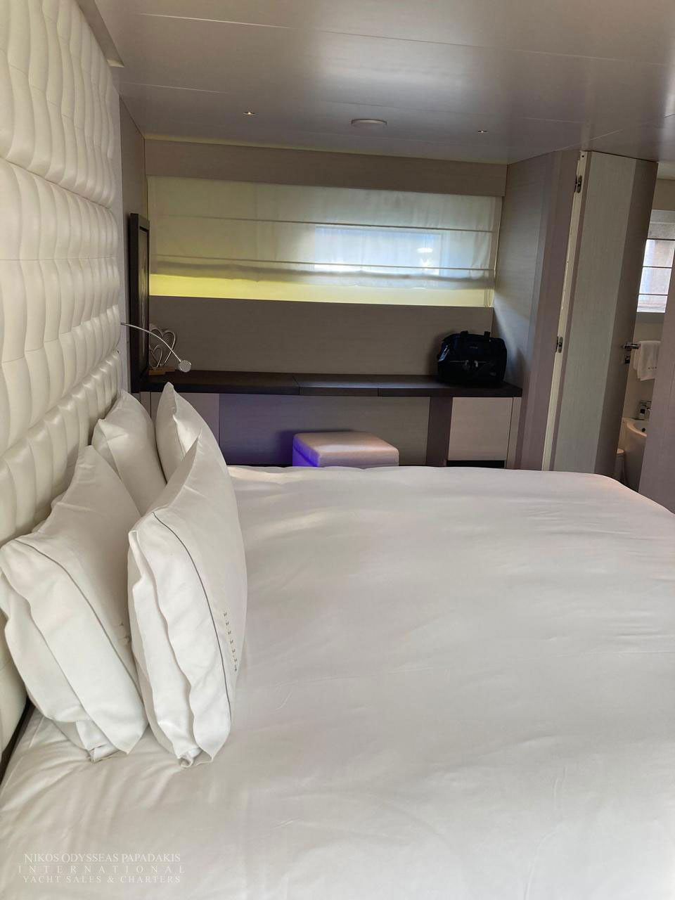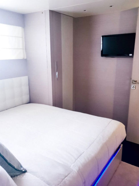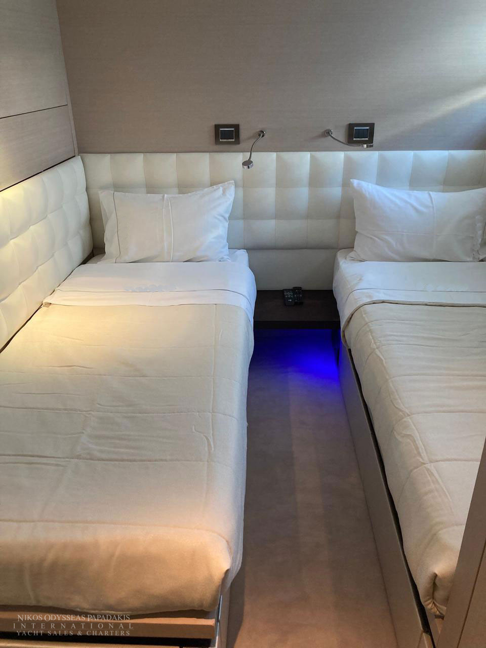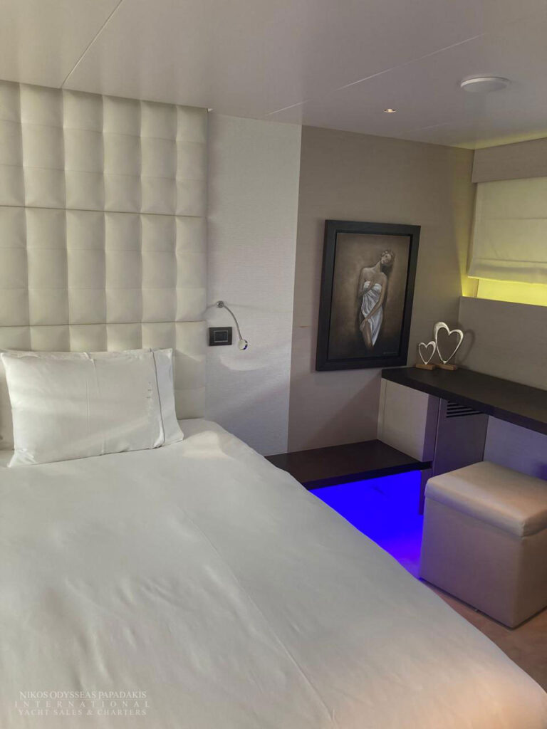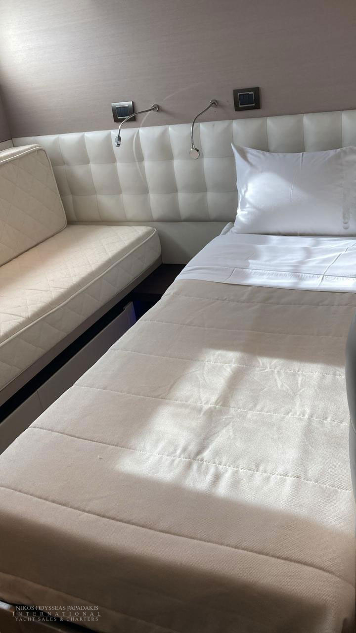• 5 cabins on the lower deck include the full beam master suite, 2 doubles and 2 twin cabins with pullman beds, which can be accessed through the central main staircase. The single beds in the twin cabins can be converted into double beds.