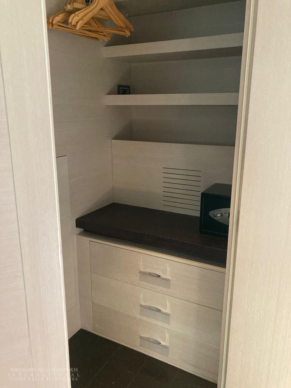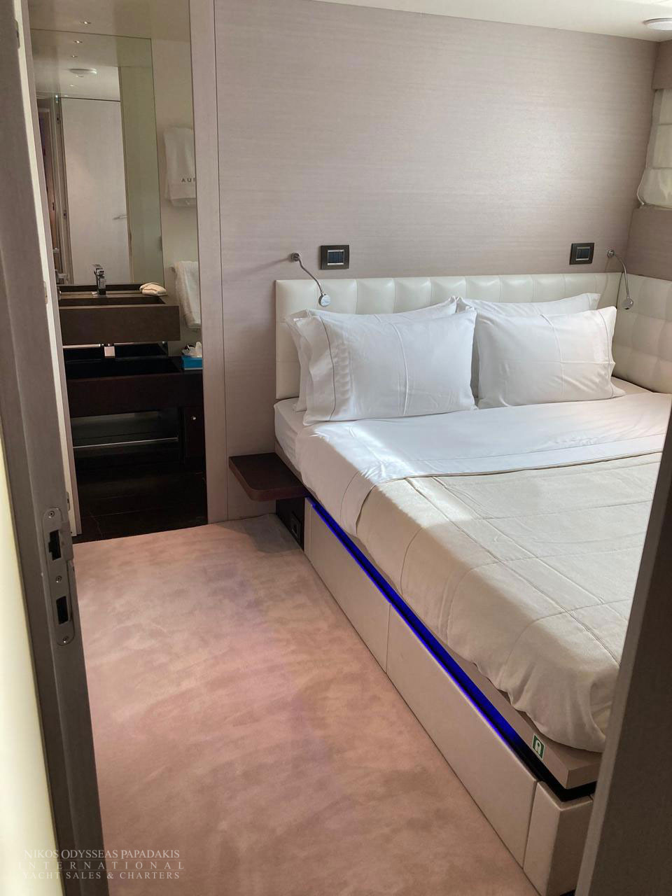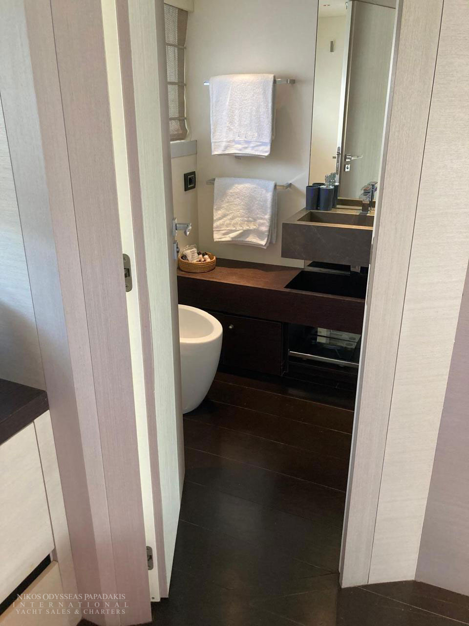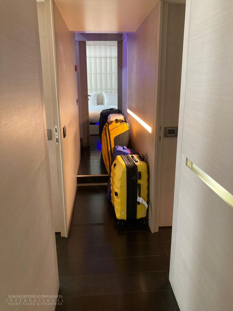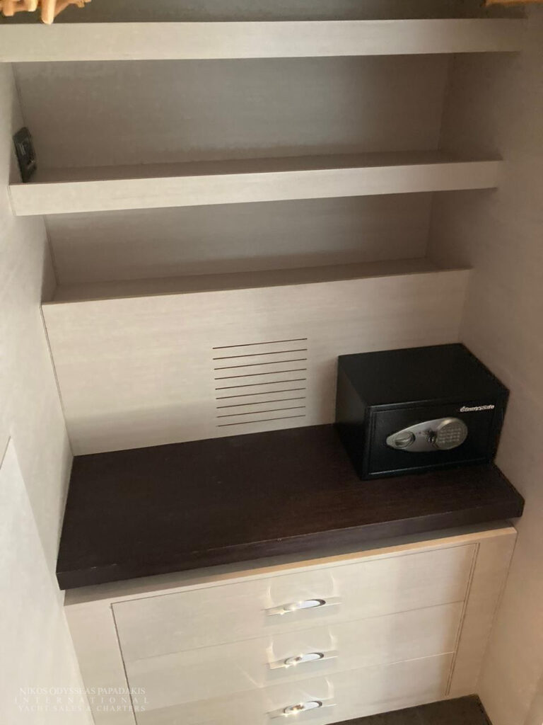 • 5 cabins on the lower deck include the full beam master suite, 2 doubles and 2 twin cabins with pullman beds, which can be accessed through the central main staircase. The single beds in the twin cabins can be converted into double beds.