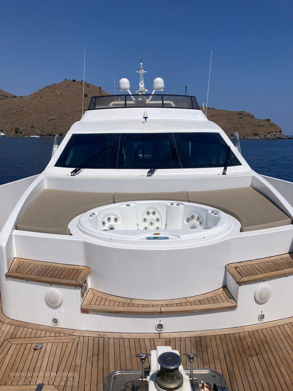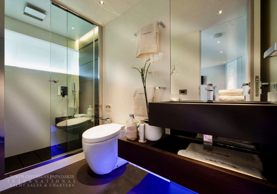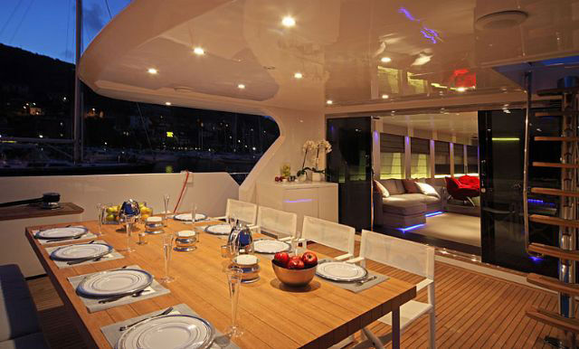 The outdoor areas of Tecnomar 100 are surprisingly spacious for relaxing. In the bow there is a jacuzzi surrounded by sunbathing cushions and bench. In the cockpit there is a large table for 10, which drops down to convert to a wide sunbathing area.