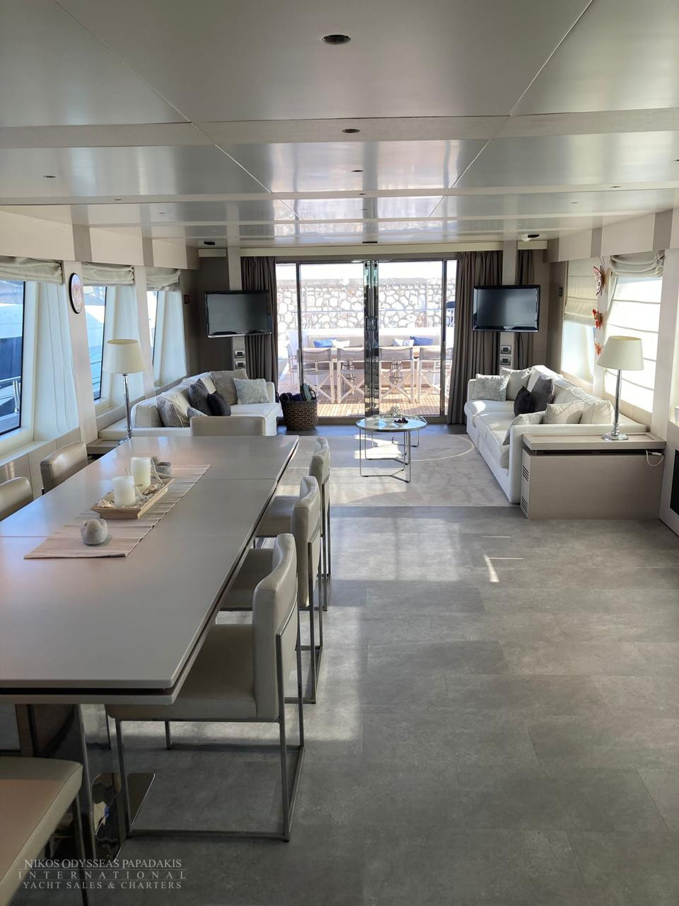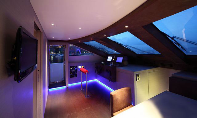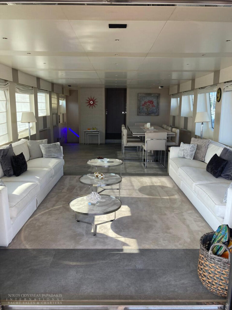 The main deck of Tecnomar 100 hosts the main salon, the dining area, the galley and the wheelhouse. The stylish interiors are have clean lines & lots of light. Natural light, visible across a great glass door, melts with the LED light under the furniture and the walls.